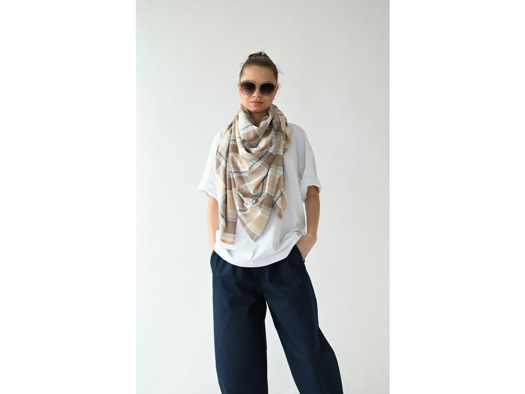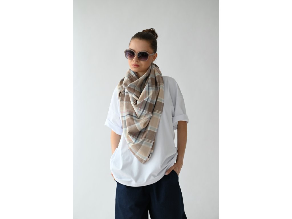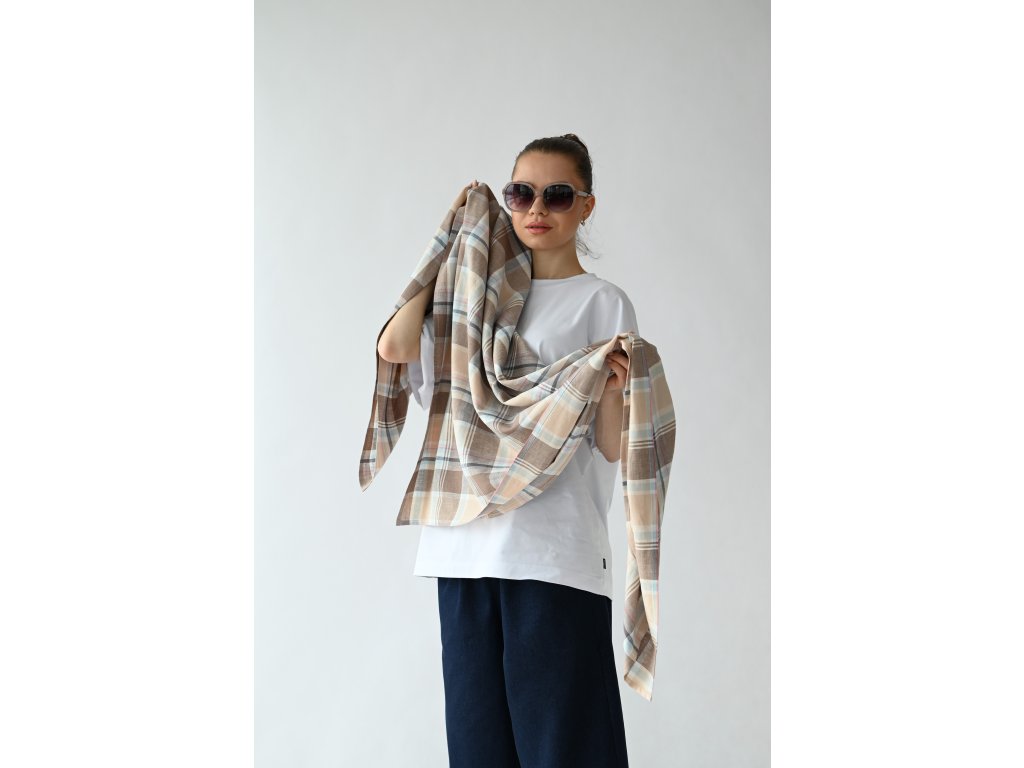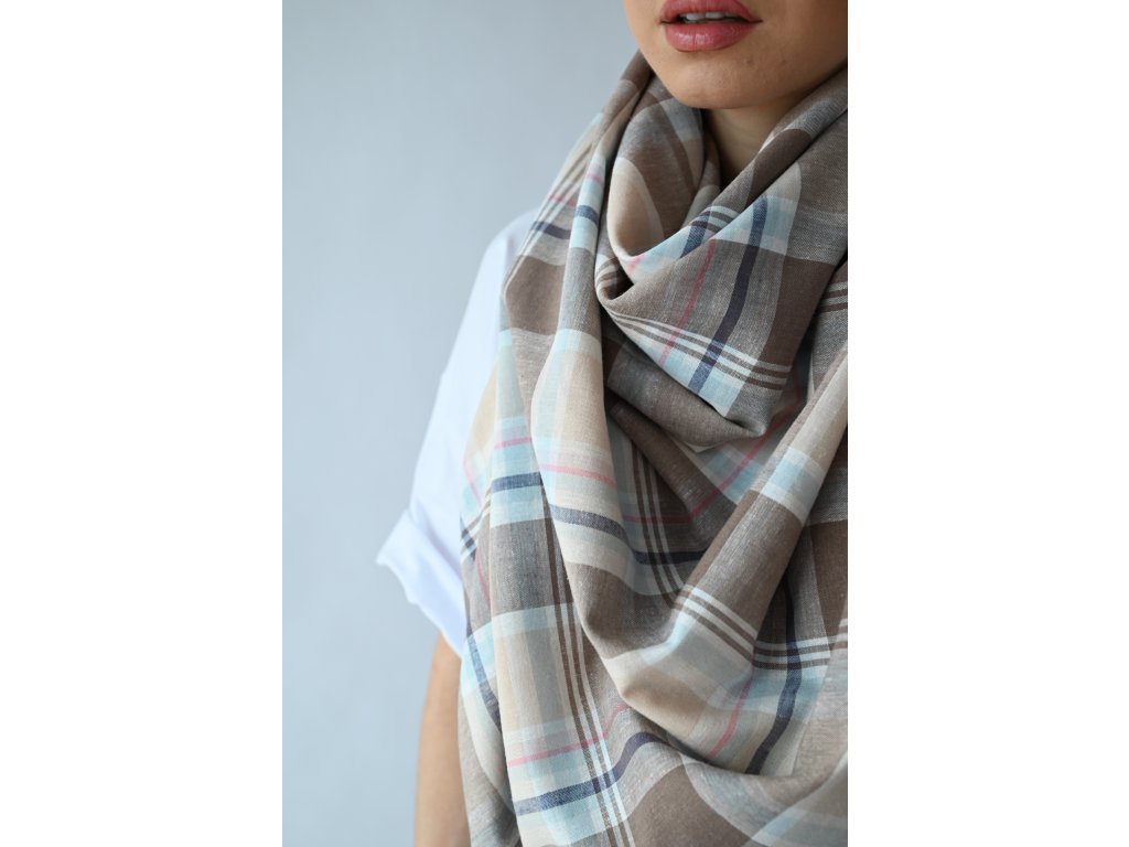 Velký šátek je ušitý ze směsi lnu a viskózy se vzorem klasického kára.