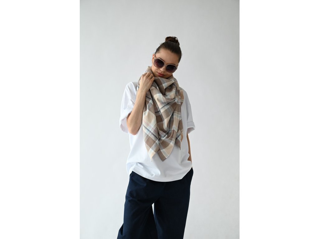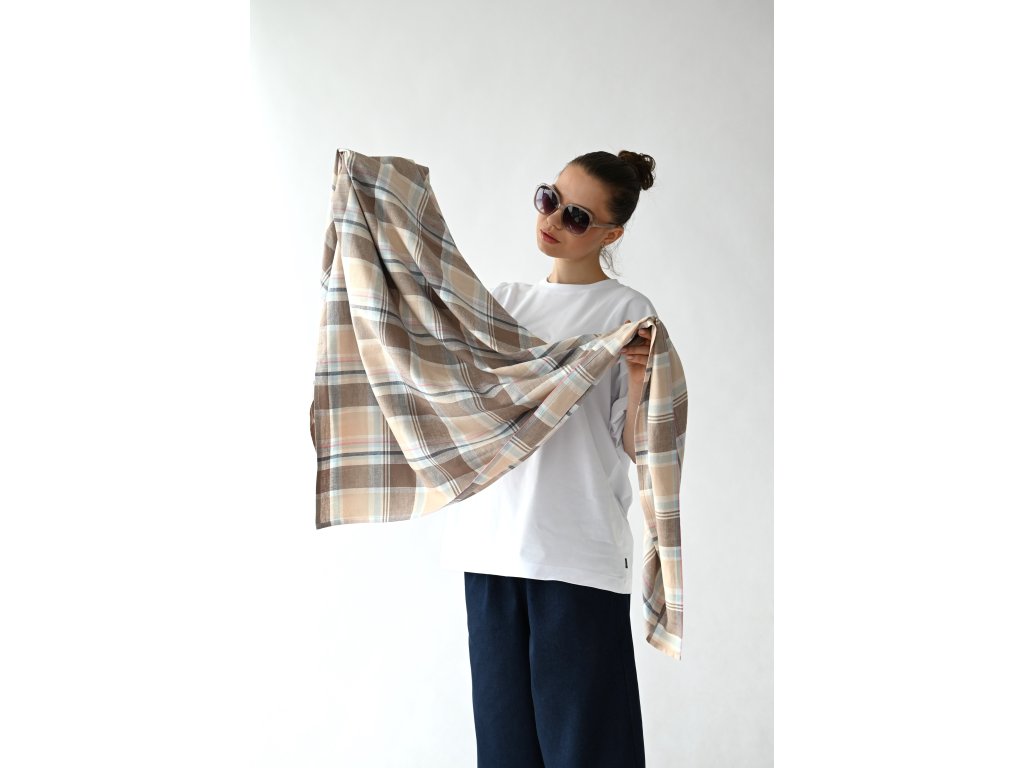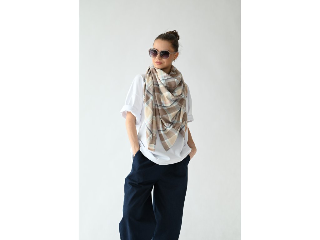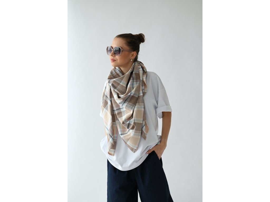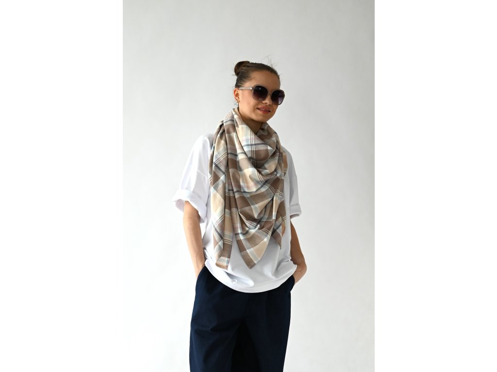 Velký šátek je ušitý ze směsi lnu a viskózy se vzorem klasického kára.