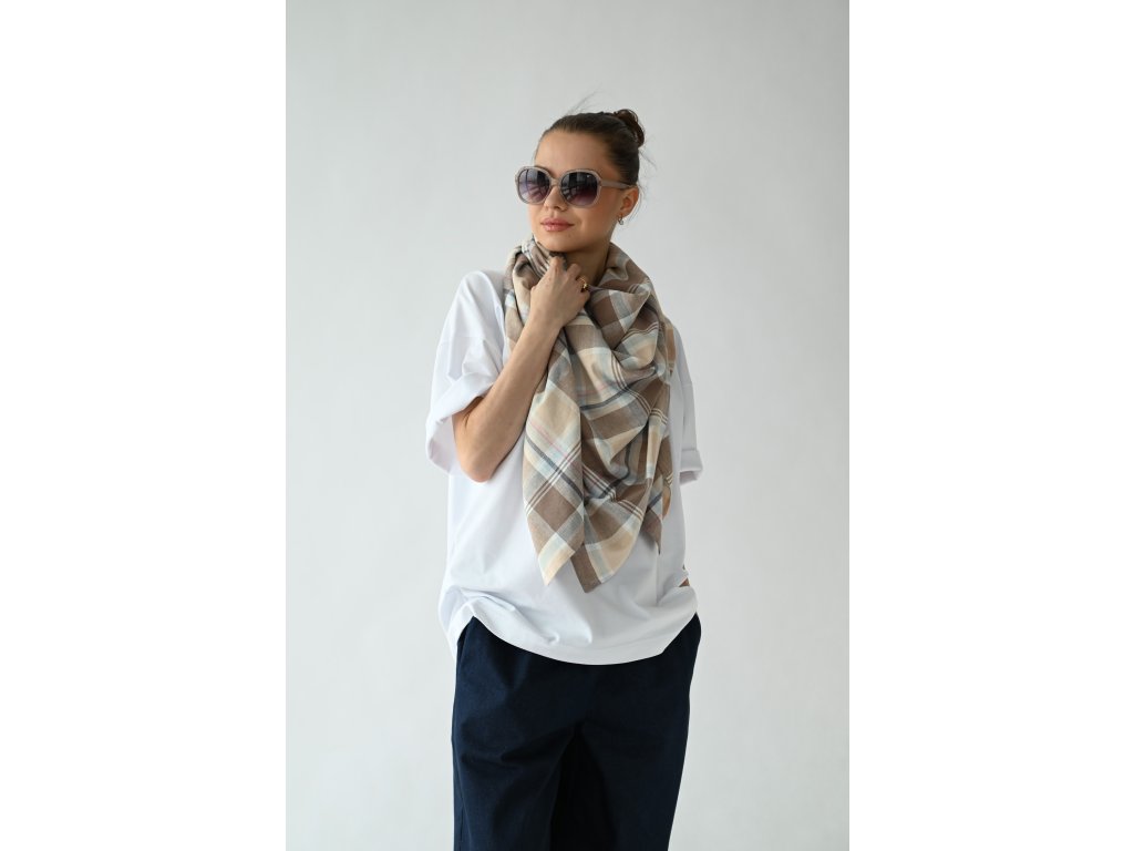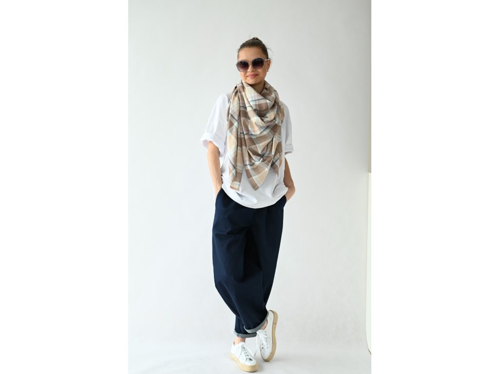 Velký šátek je ušitý ze směsi lnu a viskózy se vzorem klasického kára.