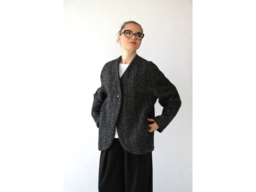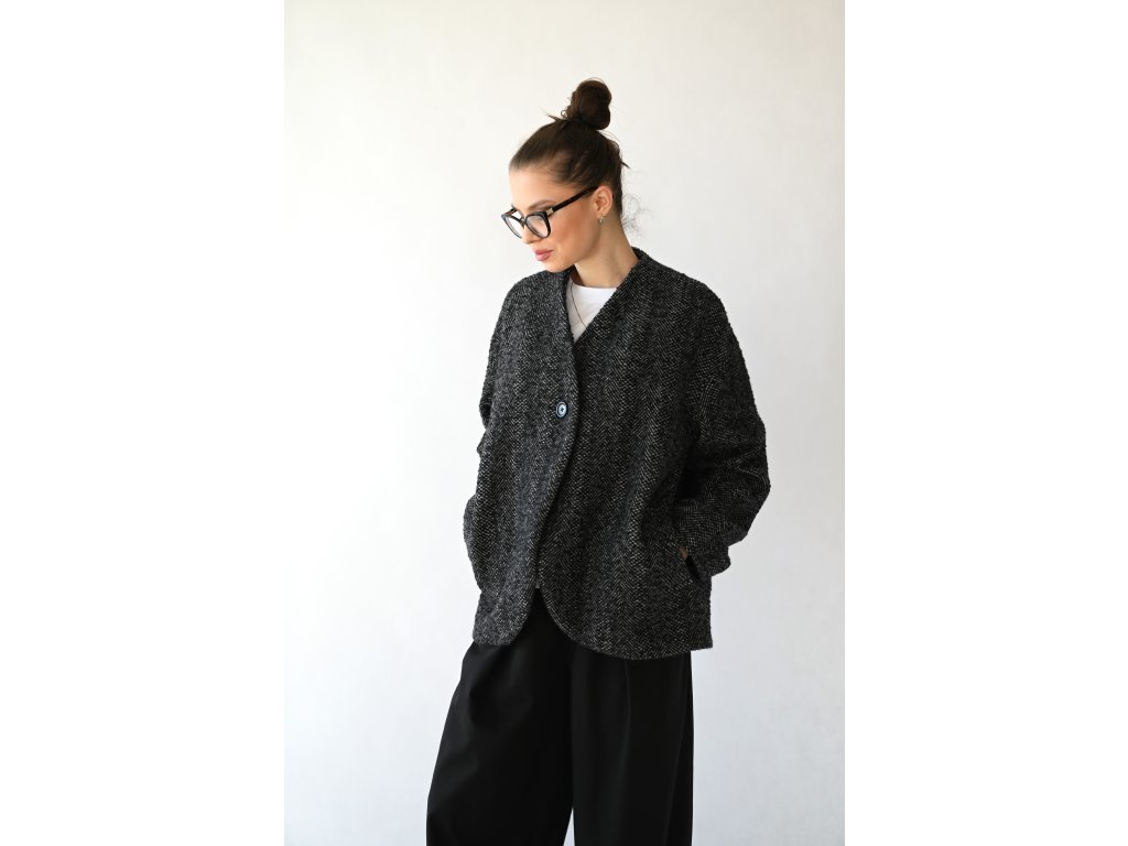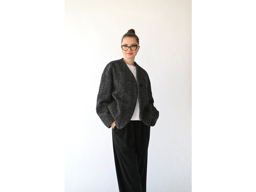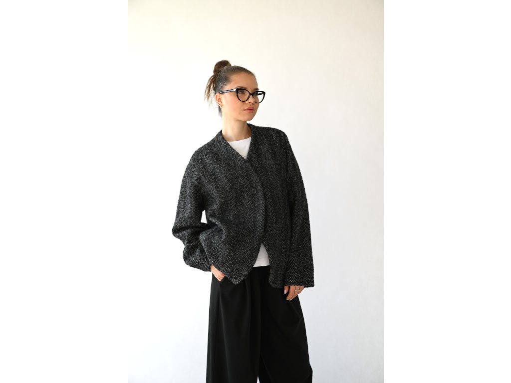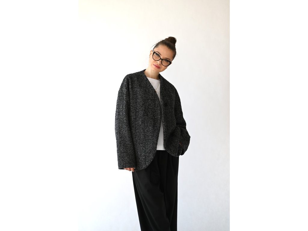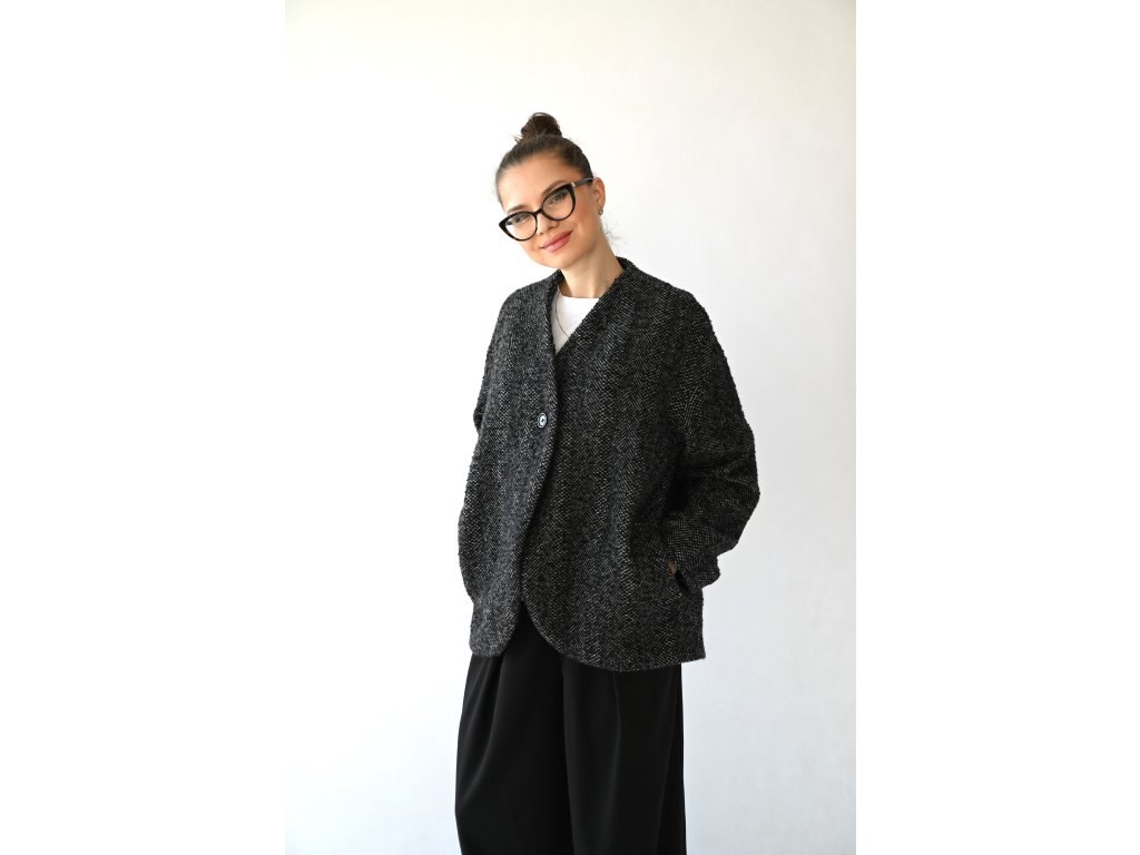 Nami je pohodlný vlněný kabátek do teplejších zimních a studenějších jarních dnů a samozřejmě na podzim. Délka je k bokům. Na předním díle jsou dvě kapsy s patkou. Zapínání je na jeden knoflík a dírku. Kabátek je komplet vypodšívkovaný podšívkou z acetátové směsi. Přední díly jsou tvarované do kulata a koncept kabátku připomíná hedvábný cocon. Inspiraci jsem našla v Japonské kultuře.
