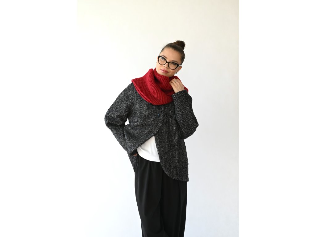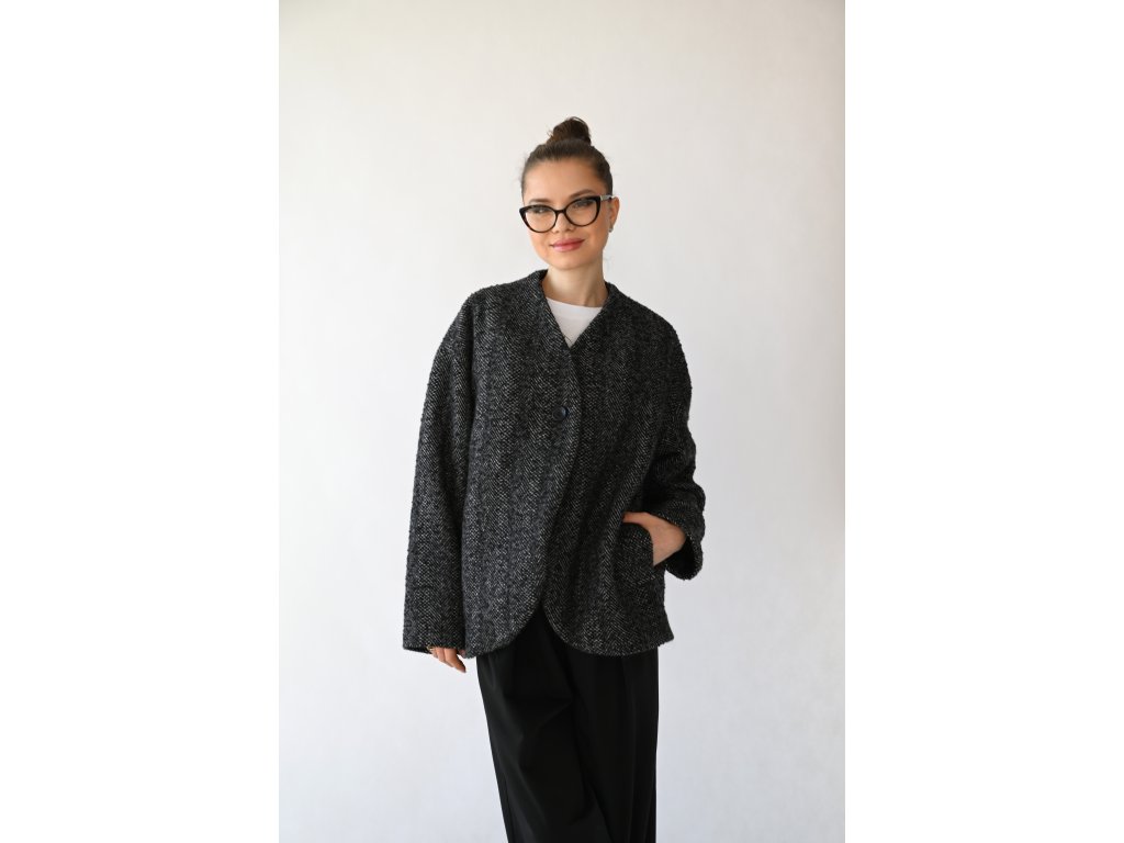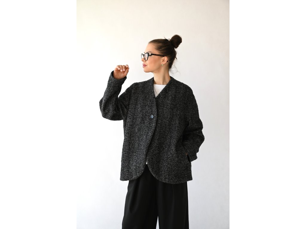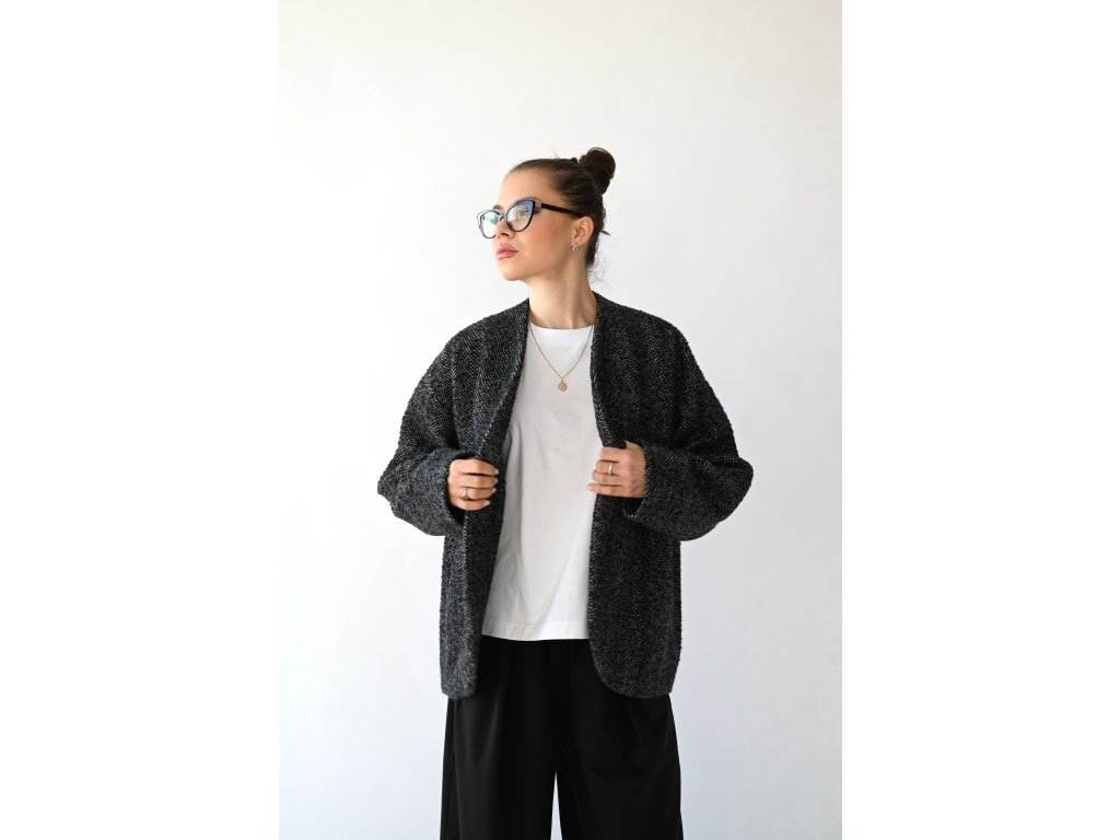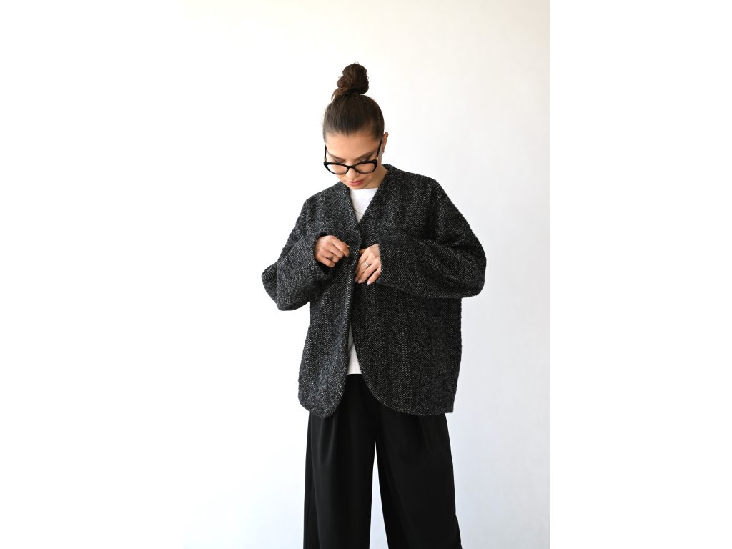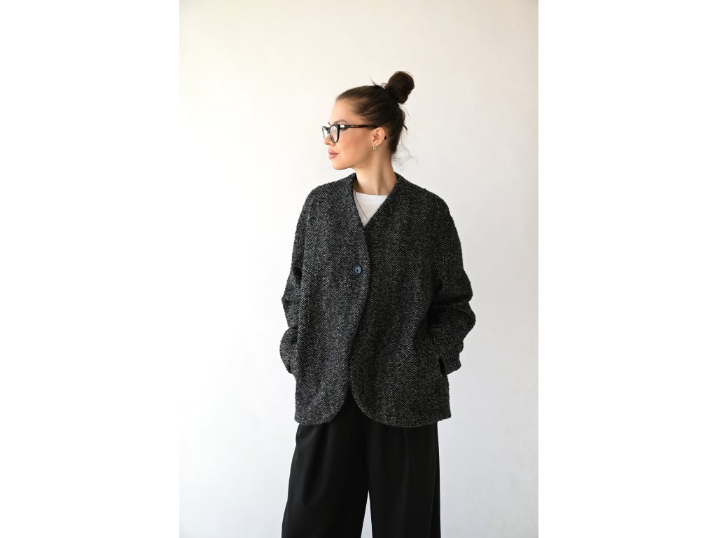 Nami je pohodlný vlněný kabátek do teplejších zimních a studenějších jarních dnů a samozřejmě na podzim. Délka je k bokům. Na předním díle jsou dvě kapsy s patkou. Zapínání je na jeden knoflík a dírku. Kabátek je komplet vypodšívkovaný podšívkou z acetátové směsi. Přední díly jsou tvarované do kulata a koncept kabátku připomíná hedvábný cocon. Inspiraci jsem našla v Japonské kultuře.