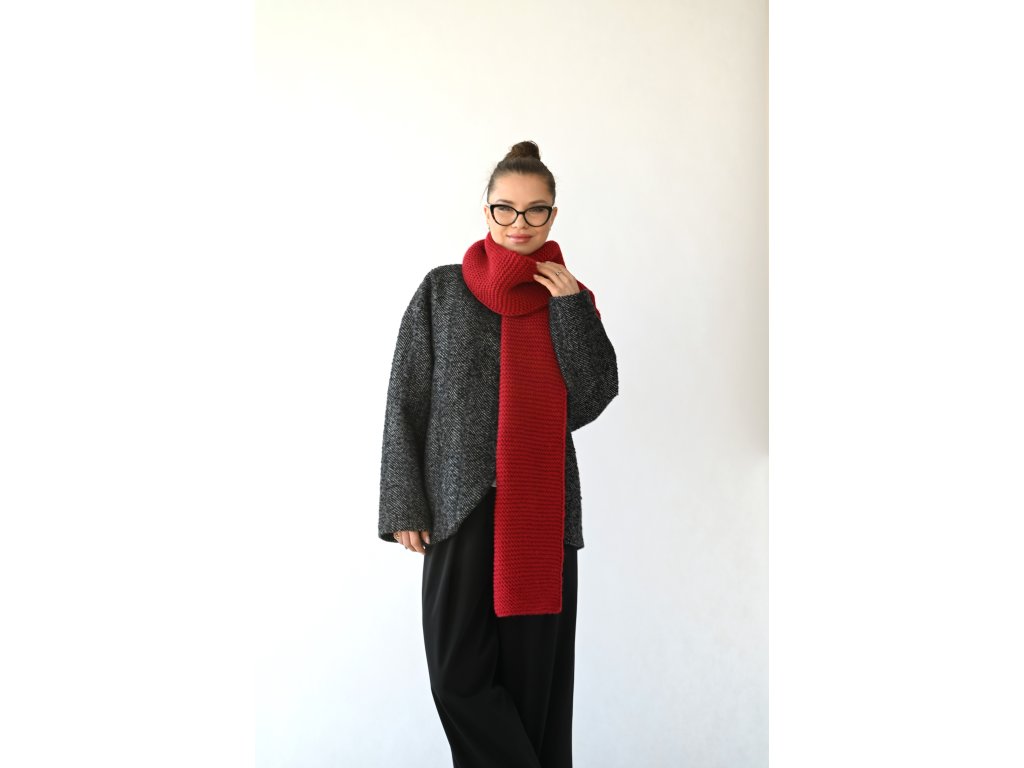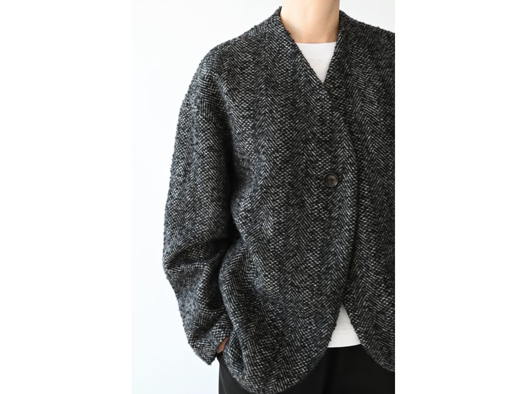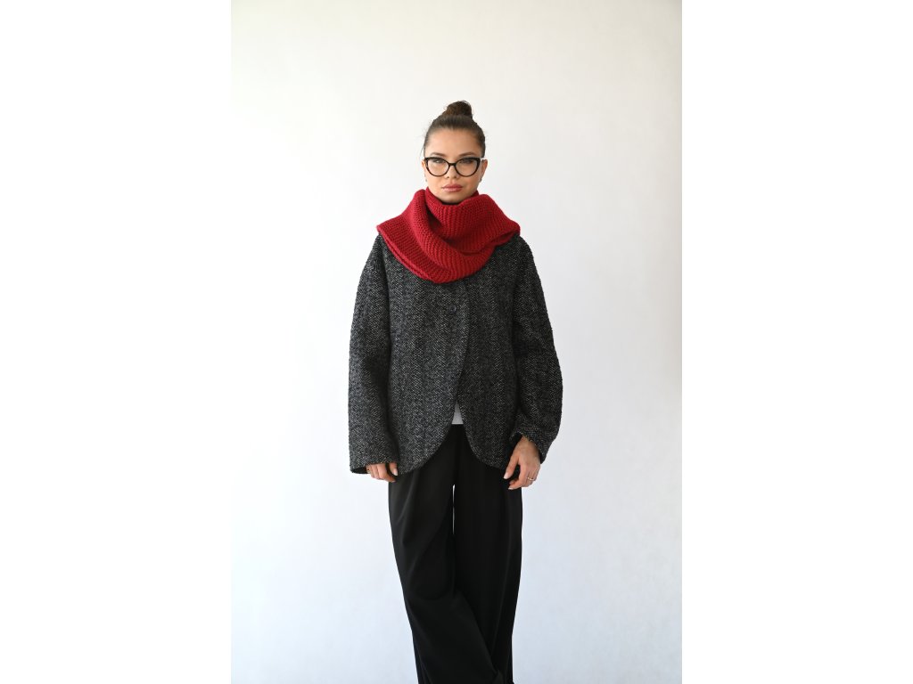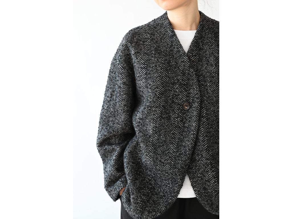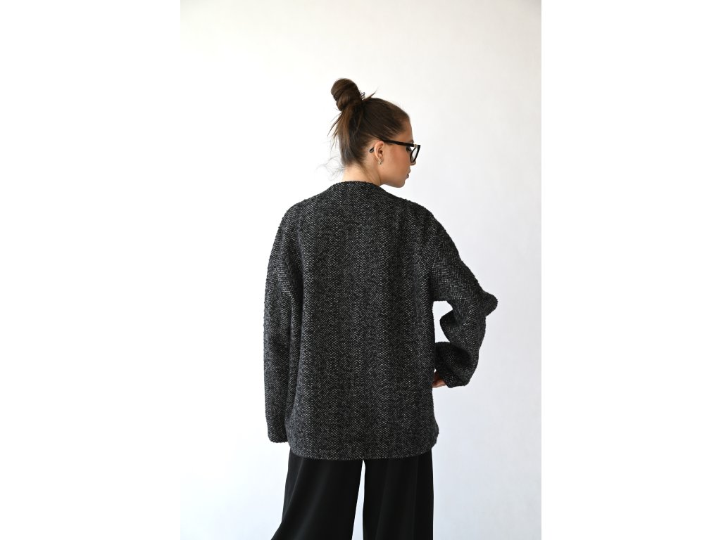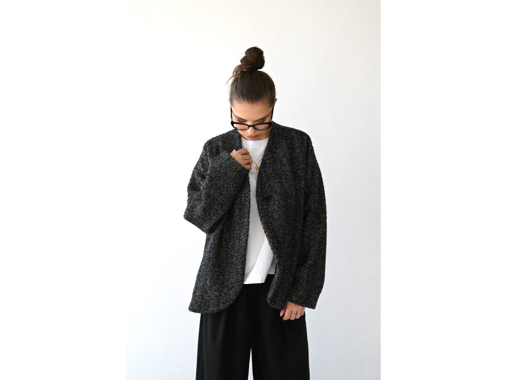 Nami je pohodlný vlněný kabátek do teplejších zimních a studenějších jarních dnů a samozřejmě na podzim. Délka je k bokům. Na předním díle jsou dvě kapsy s patkou. Zapínání je na jeden knoflík a dírku. Kabátek je komplet vypodšívkovaný podšívkou z acetátové směsi. Přední díly jsou tvarované do kulata a koncept kabátku připomíná hedvábný cocon. Inspiraci jsem našla v Japonské kultuře.