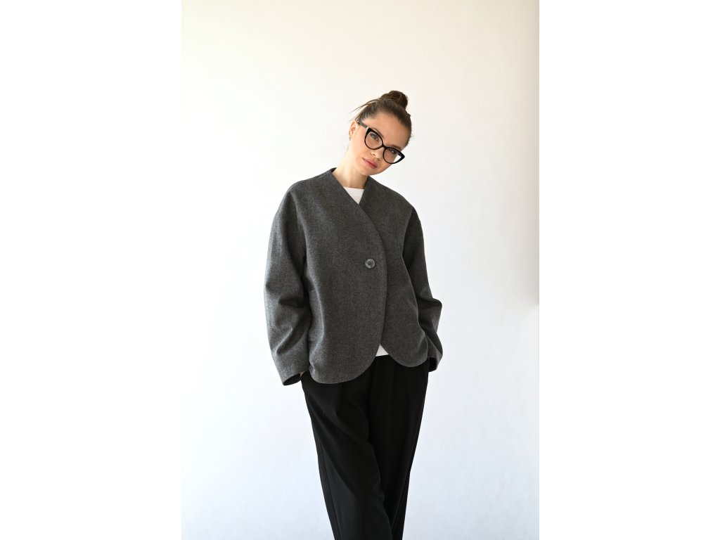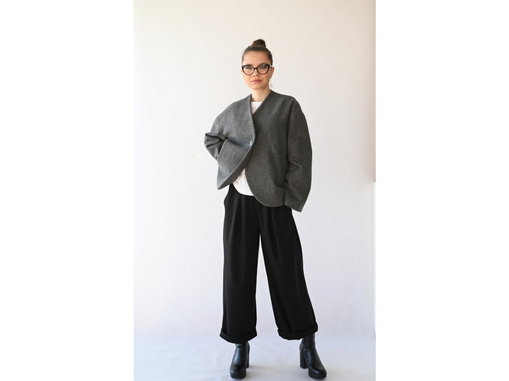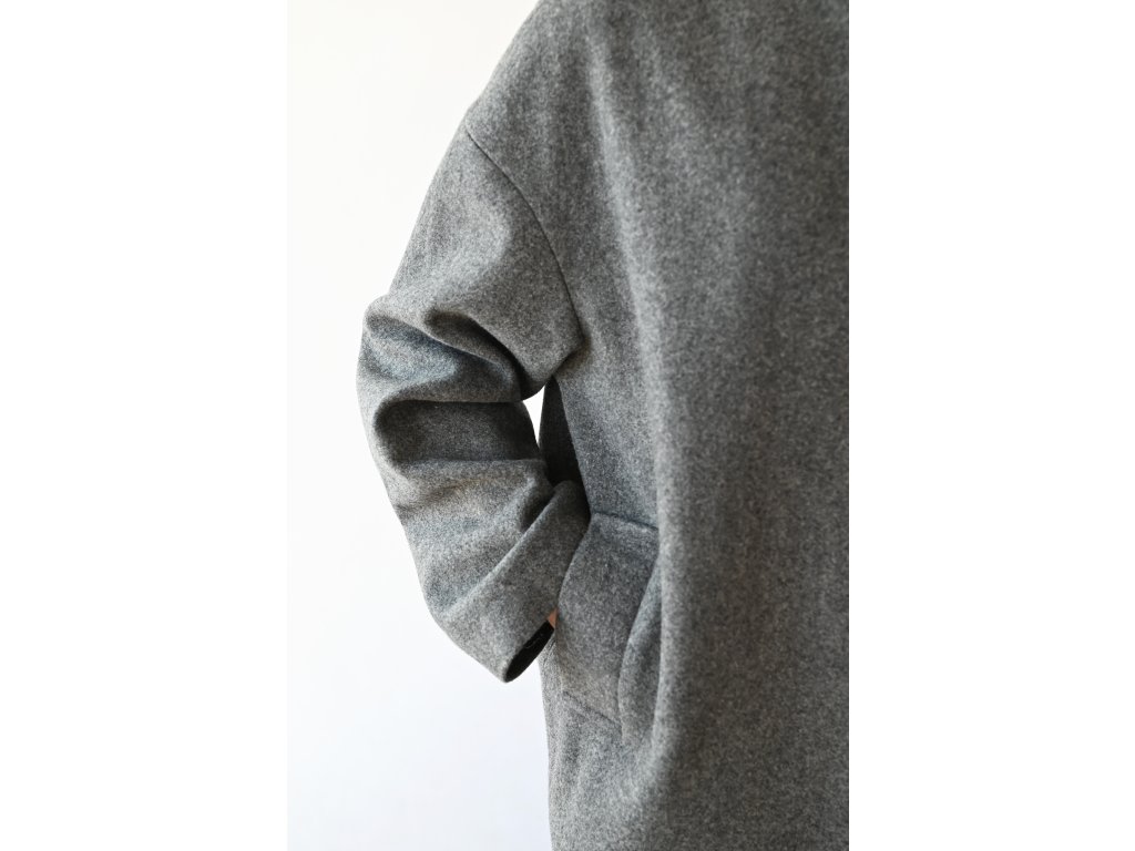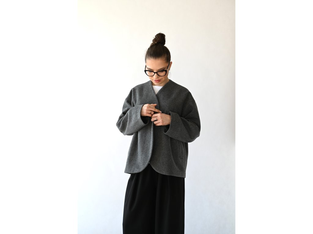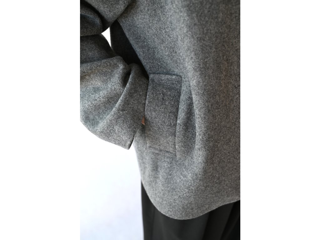 Nami je pohodlný vlněný kabátek do teplejších zimních a studenějších jarních dnů a samozřejmě na podzim. Délka je k bokům. Na předním díle jsou dvě kapsy s patkou. Zapínání je na jeden knoflík a dírku. Kabátek je komplet vypodšívkovaný podšívkou z acetátové směsi. Přední díly jsou tvarované do kulata a koncept kabátku připomíná hedvábný cocon. Inspiraci jsem našla v japonské kultuře.