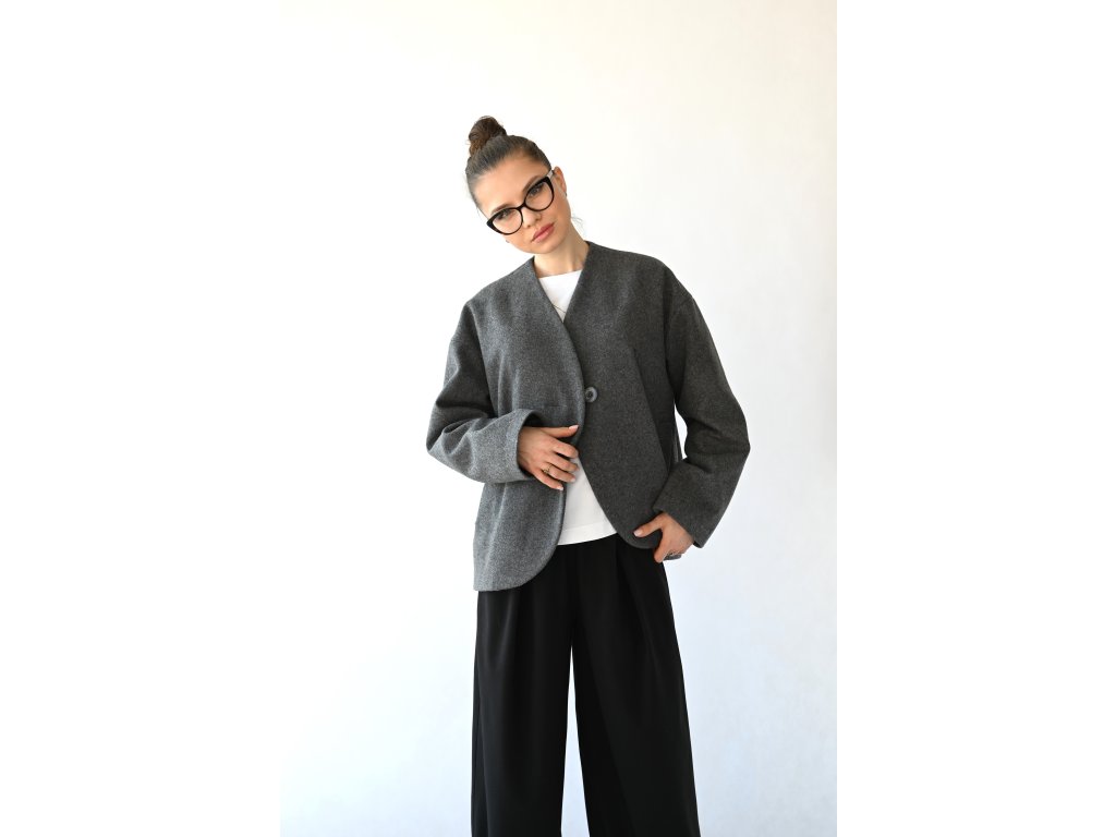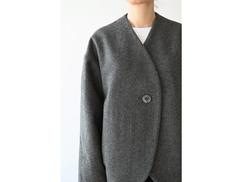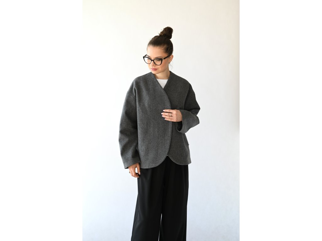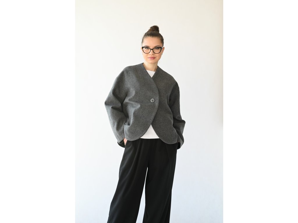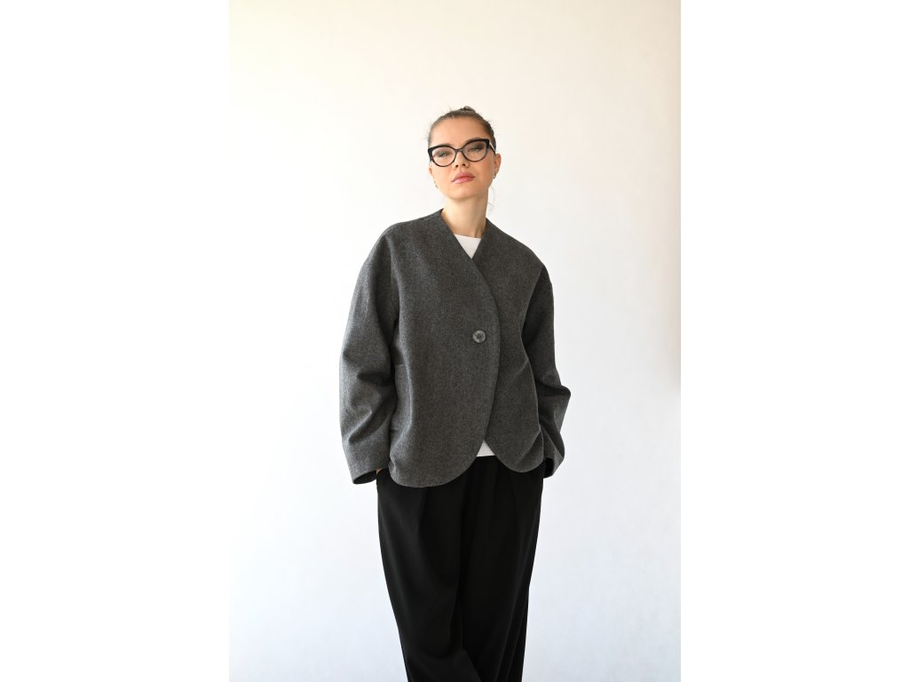 Nami je pohodlný vlněný kabátek do teplejších zimních a studenějších jarních dnů a samozřejmě na podzim. Délka je k bokům. Na předním díle jsou dvě kapsy s patkou. Zapínání je na jeden knoflík a dírku. Kabátek je komplet vypodšívkovaný podšívkou z acetátové směsi. Přední díly jsou tvarované do kulata a koncept kabátku připomíná hedvábný cocon. Inspiraci jsem našla v japonské kultuře.