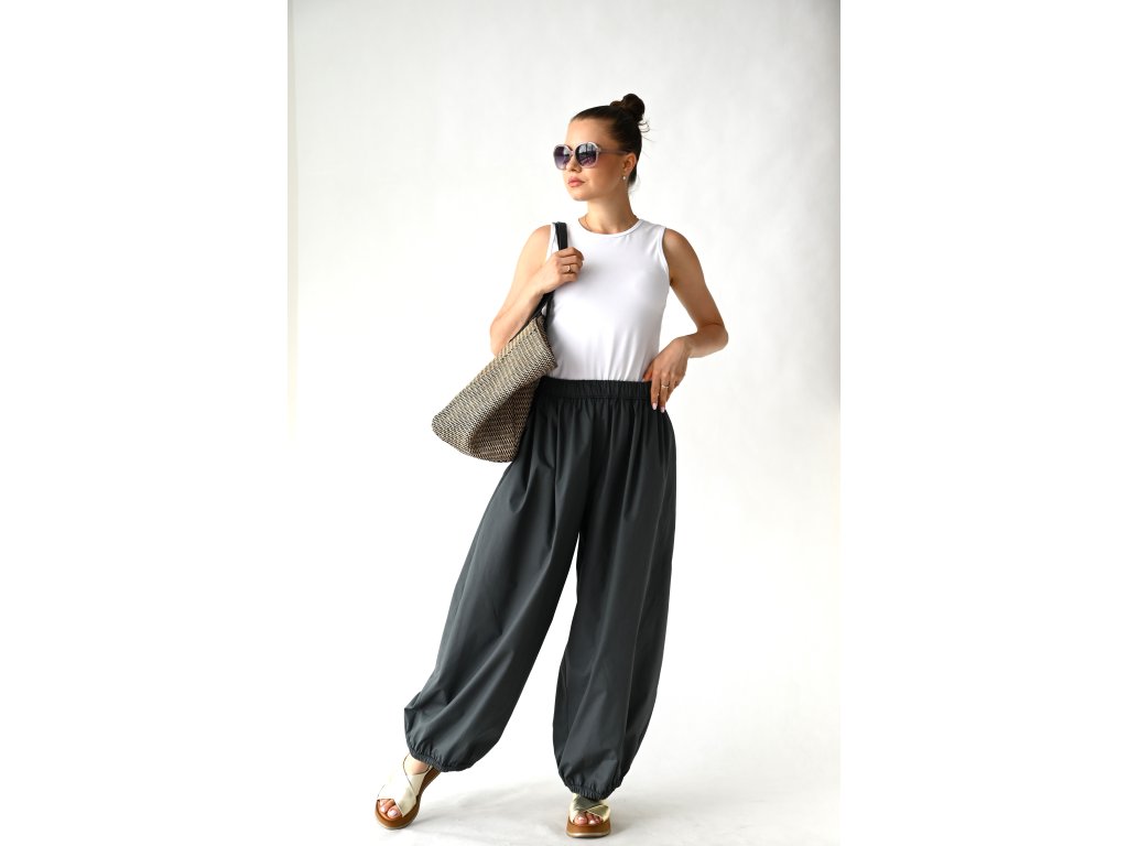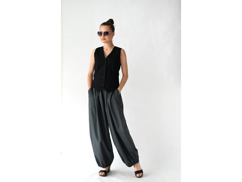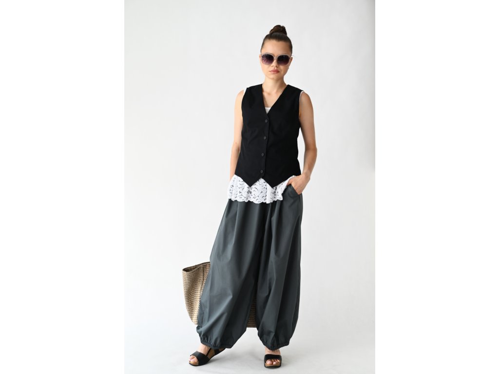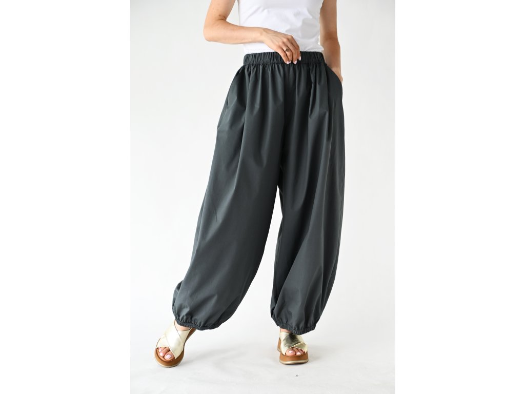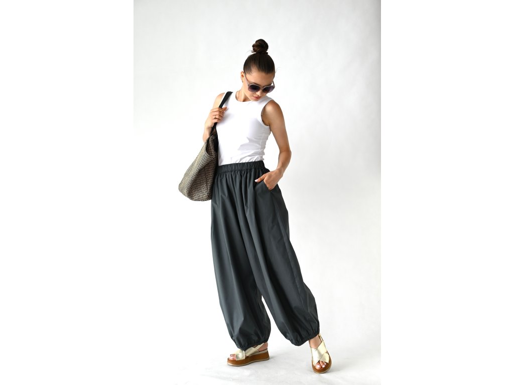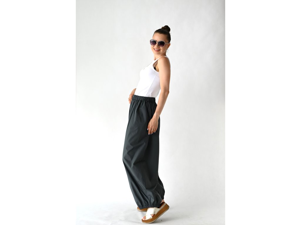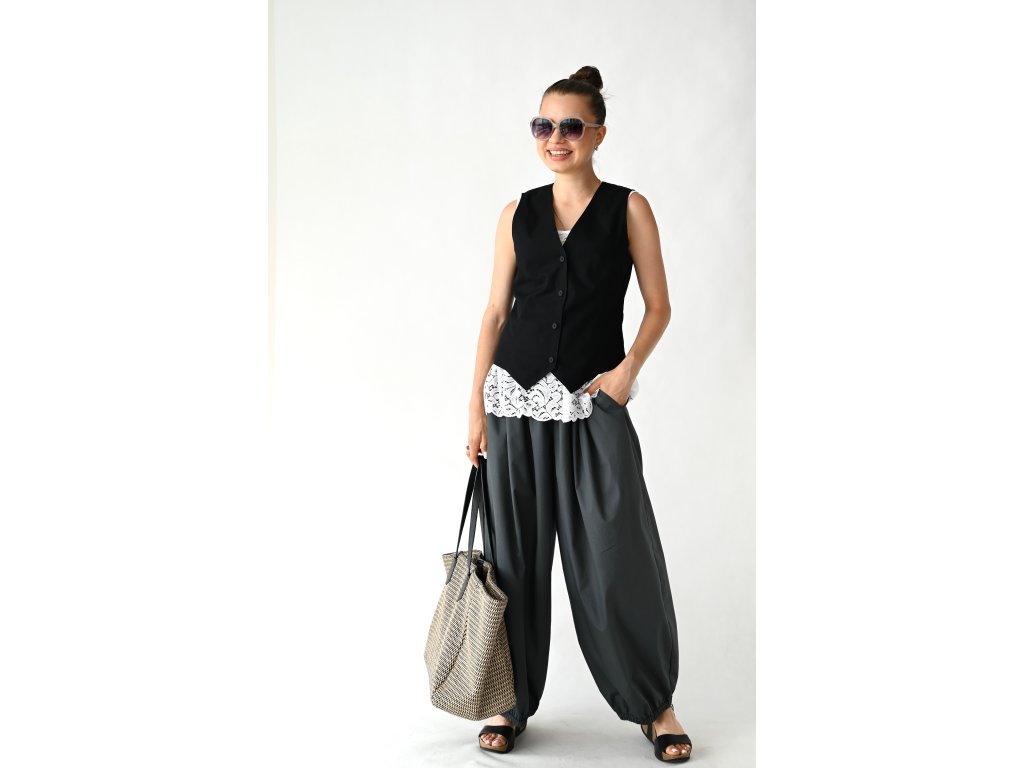 Kalhoty Hiroi mají velkoryse střižené široké nohavice. Mají kapsy na předním díle a jsou v pase řasené a navíc všité do široké pohodlné gumy. Dole mají šířku staženou do tunýlku s gumou. Materiál, ze kterého jsou kalhoty ušity je velmi kvalitní popelín se středně vysokou gramáží.