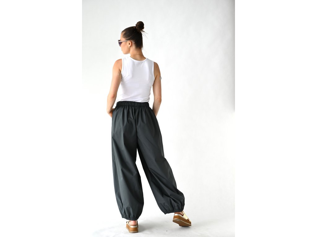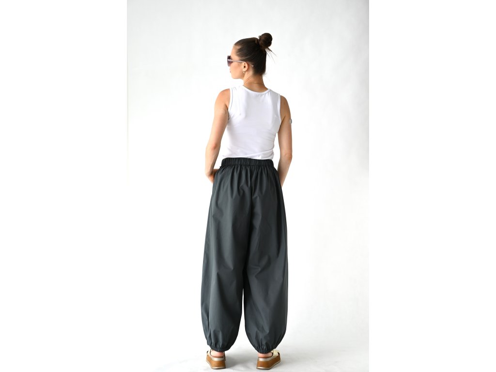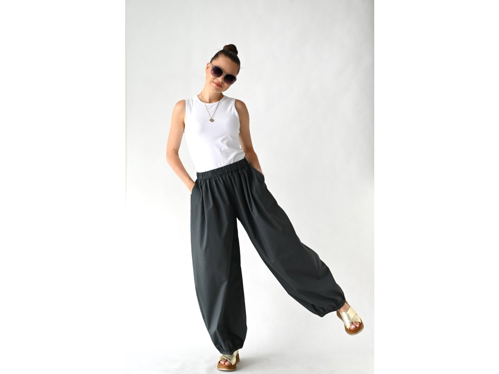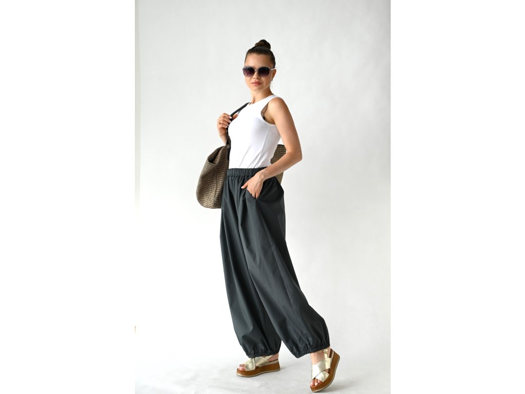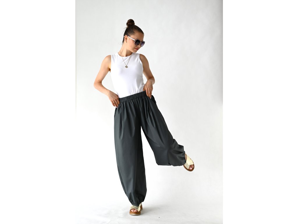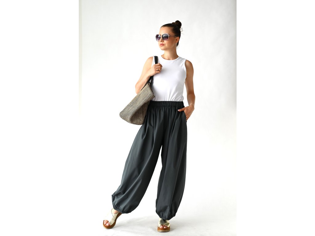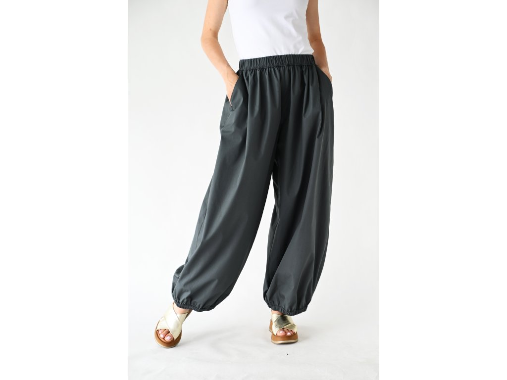 Kalhoty Hiroi mají velkoryse střižené široké nohavice. Mají kapsy na předním díle a jsou v pase řasené a navíc všité do široké pohodlné gumy. Dole mají šířku staženou do tunýlku s gumou. Materiál, ze kterého jsou kalhoty ušity je velmi kvalitní popelín se středně vysokou gramáží.