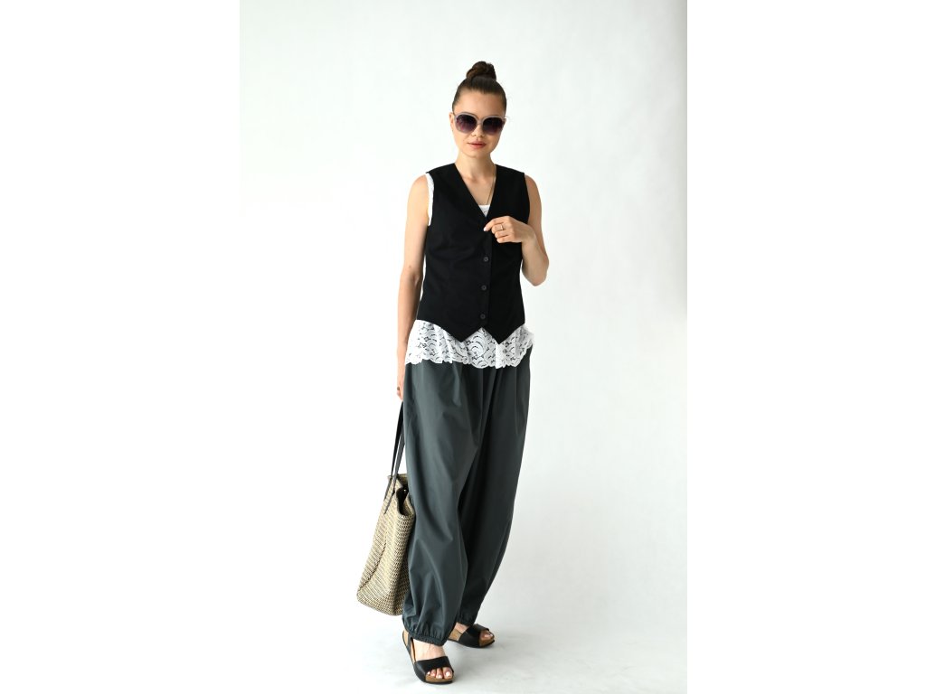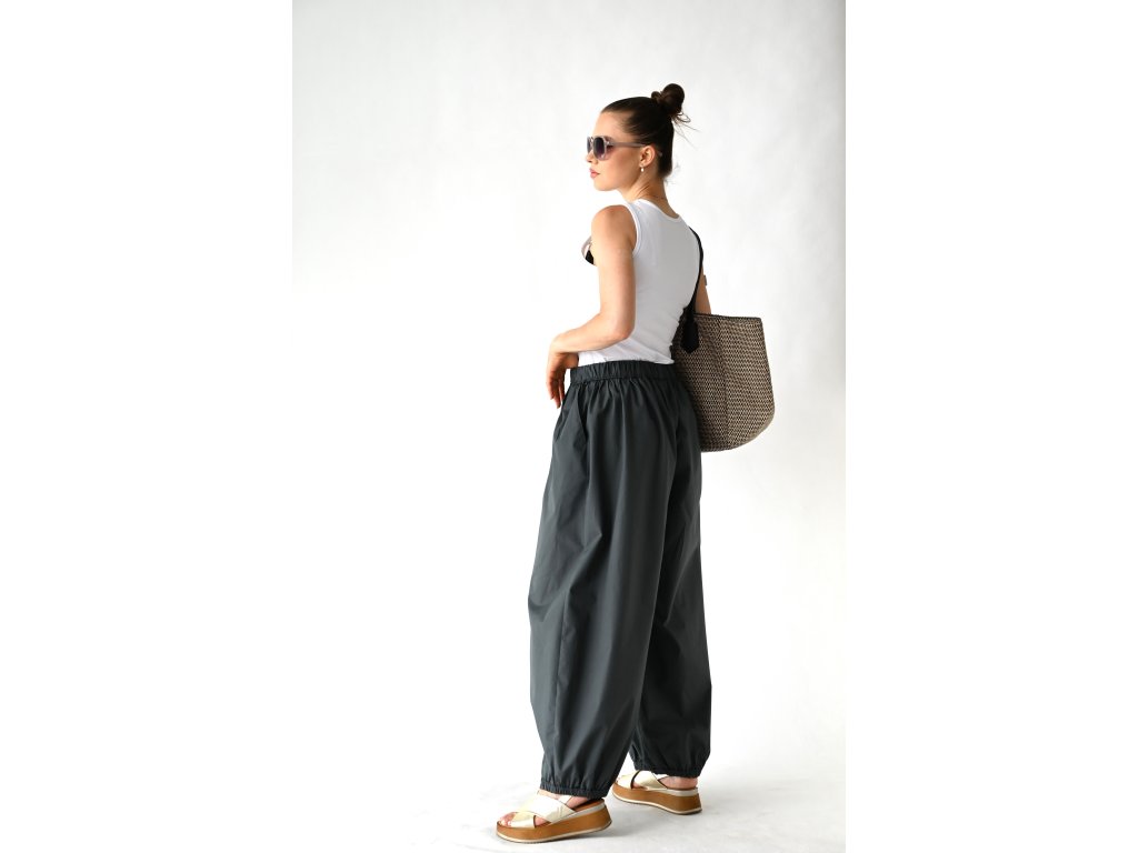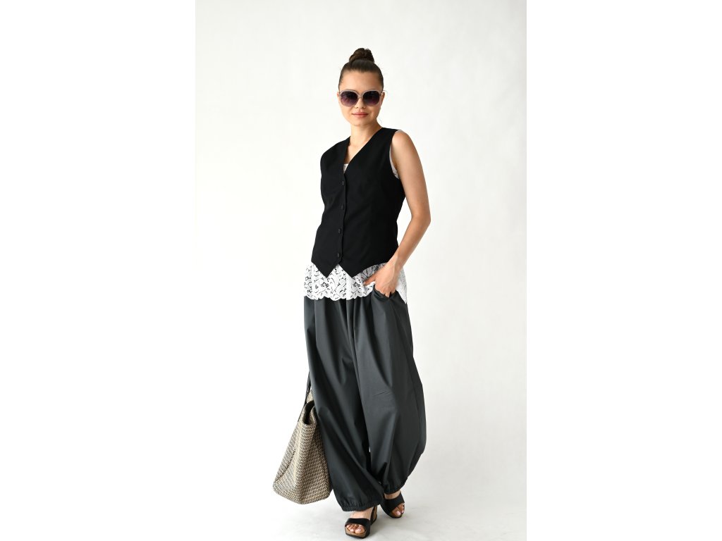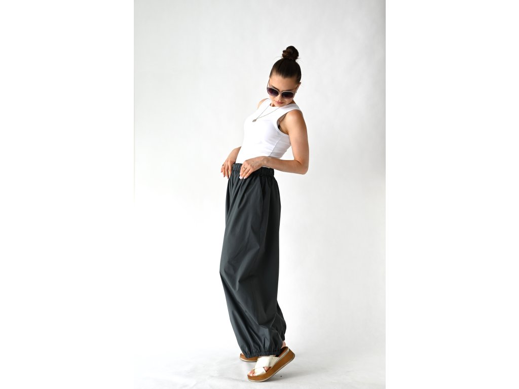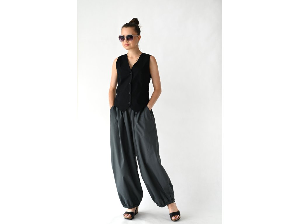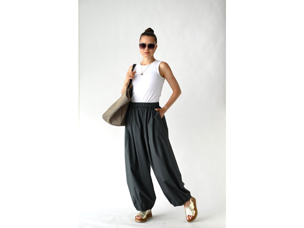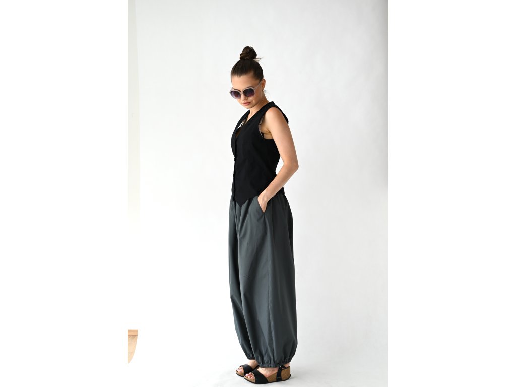 Kalhoty Hiroi mají velkoryse střižené široké nohavice. Mají kapsy na předním díle a jsou v pase řasené a navíc všité do široké pohodlné gumy. Dole mají šířku staženou do tunýlku s gumou. Materiál, ze kterého jsou kalhoty ušity je velmi kvalitní popelín se středně vysokou gramáží.