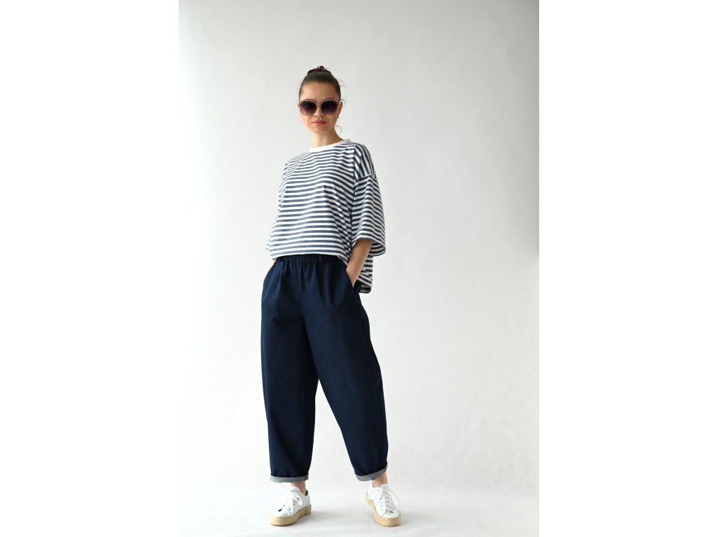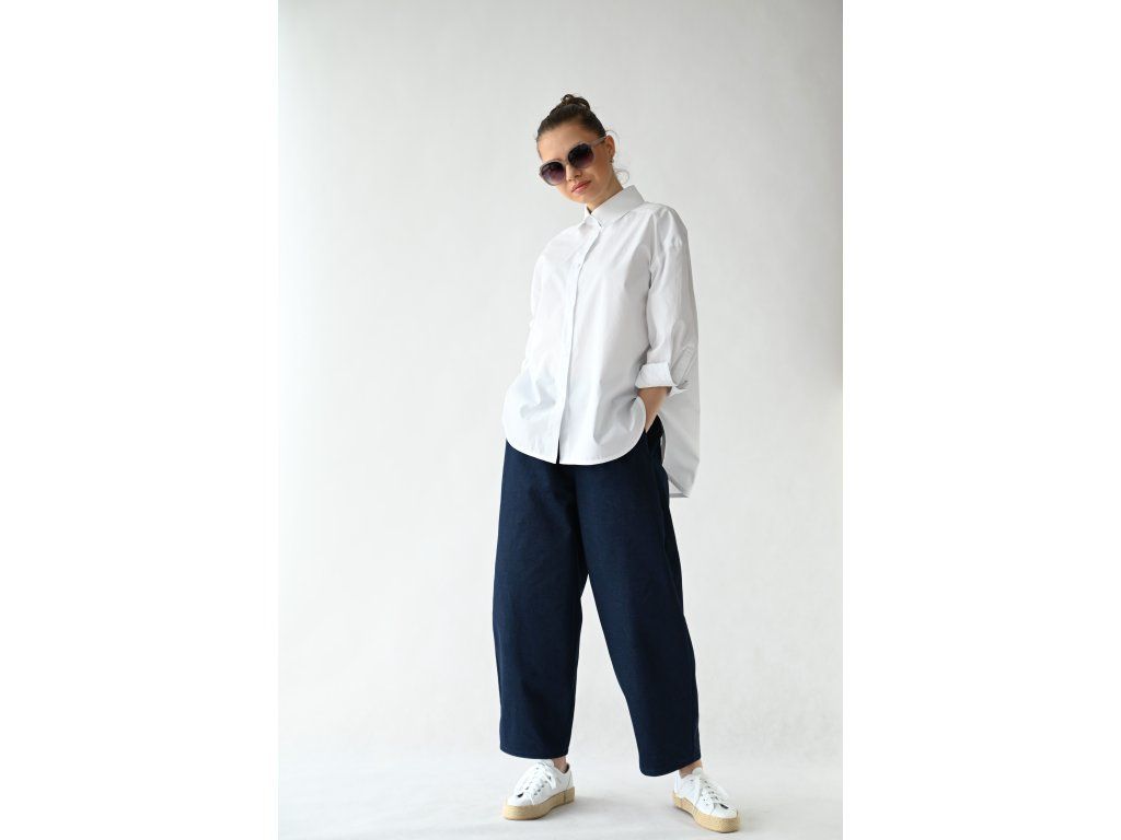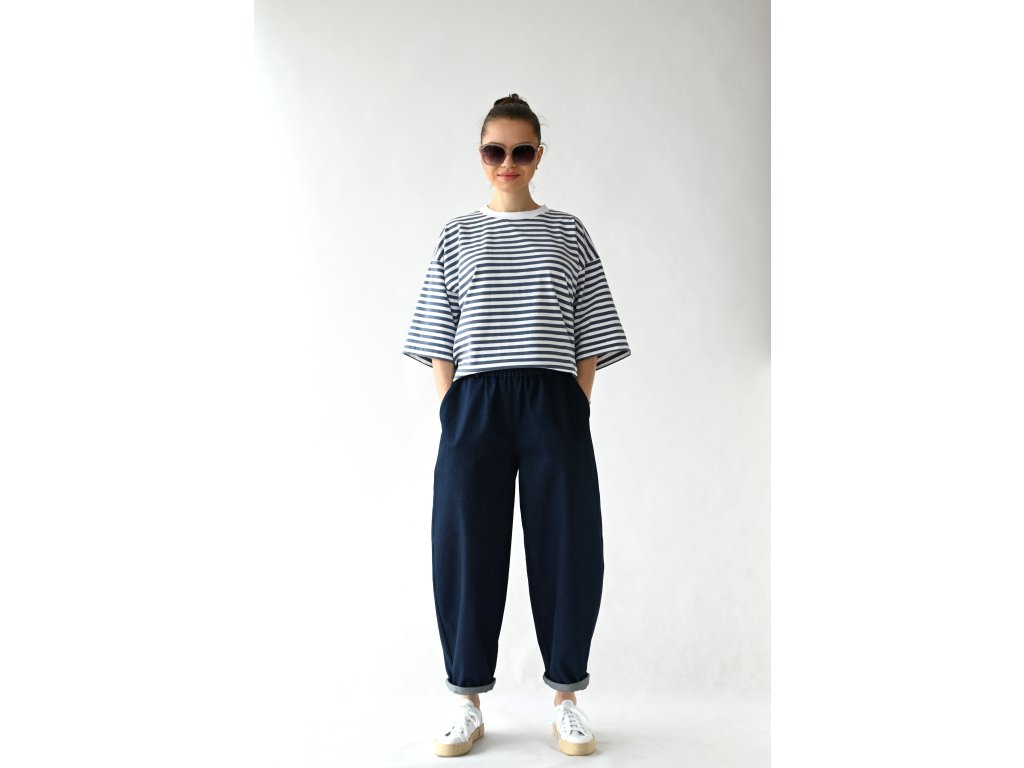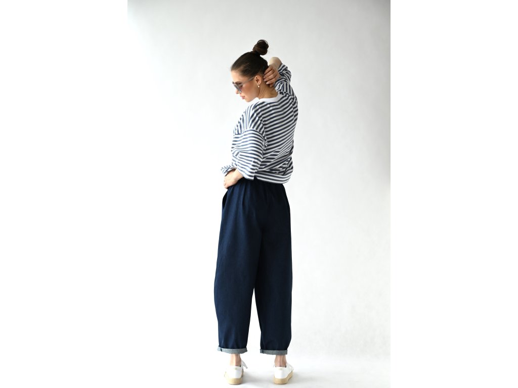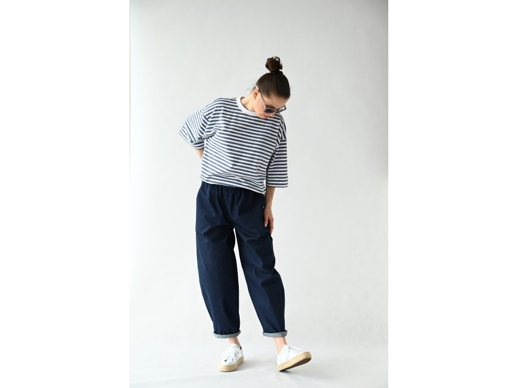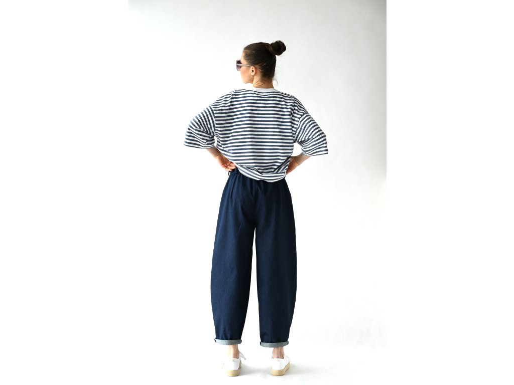 Kalhoty Kami mají volný barrel střih, který se směrem dolů zužuje. Mají kapsy na předním díle a v pase širokou pohodlnou gumu a poutka na pásek. Konec nohavic je podšitý, aby hezky držel tvar.