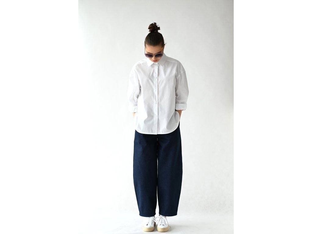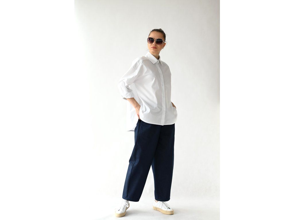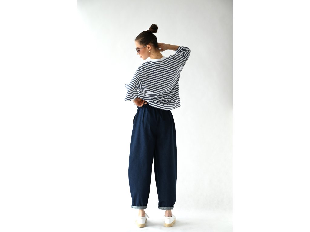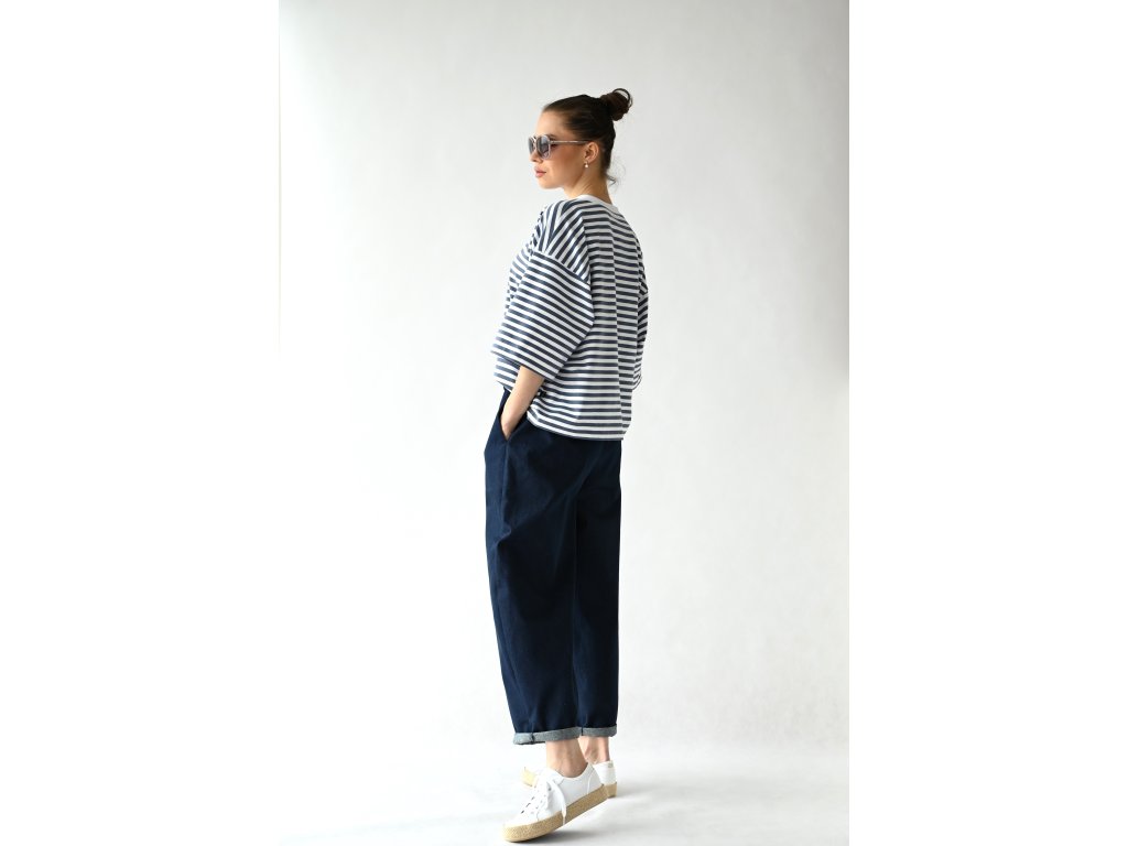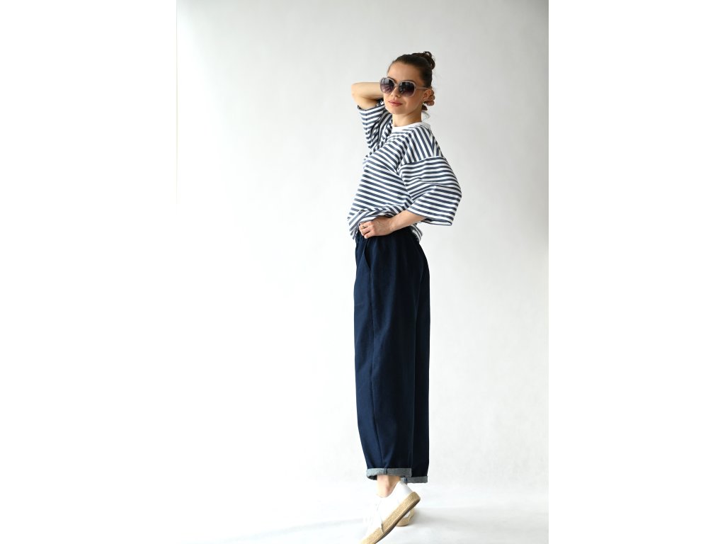 Kalhoty Kami mají volný barrel střih, který se směrem dolů zužuje. Mají kapsy na předním díle a v pase širokou pohodlnou gumu a poutka na pásek. Konec nohavic je podšitý, aby hezky držel tvar.