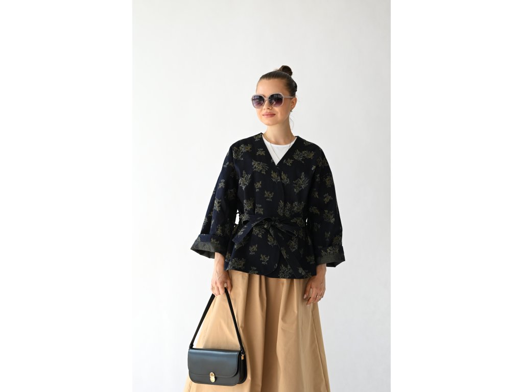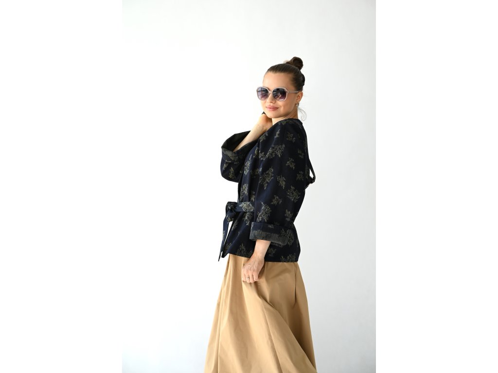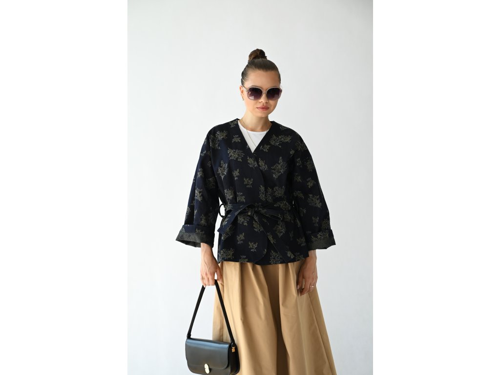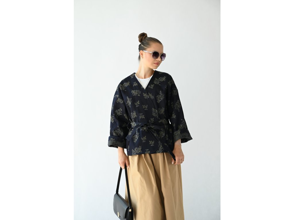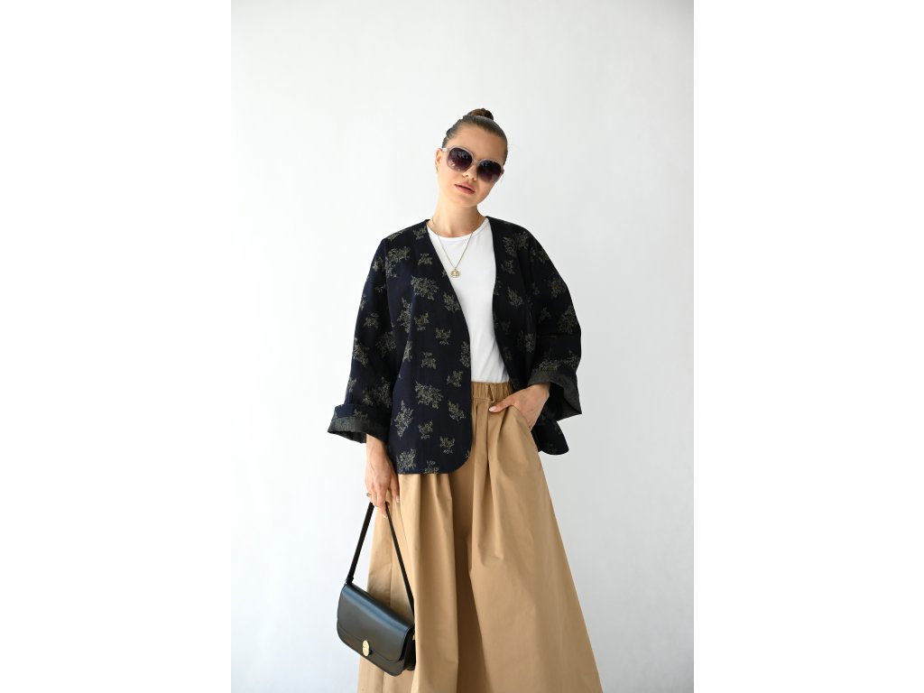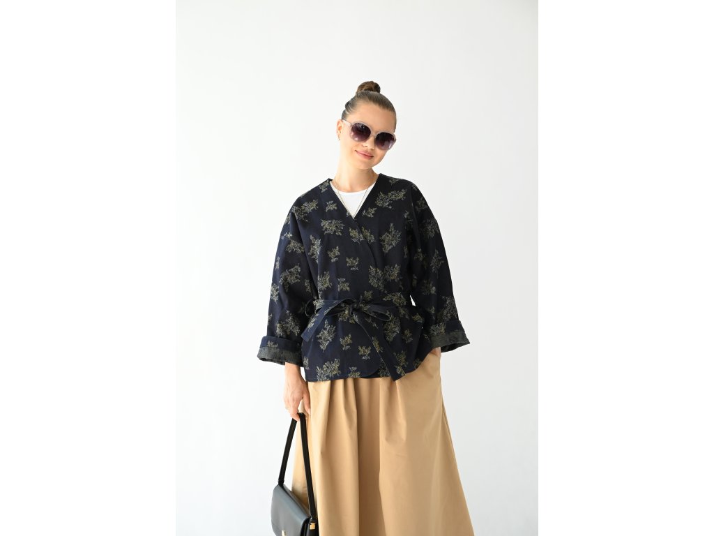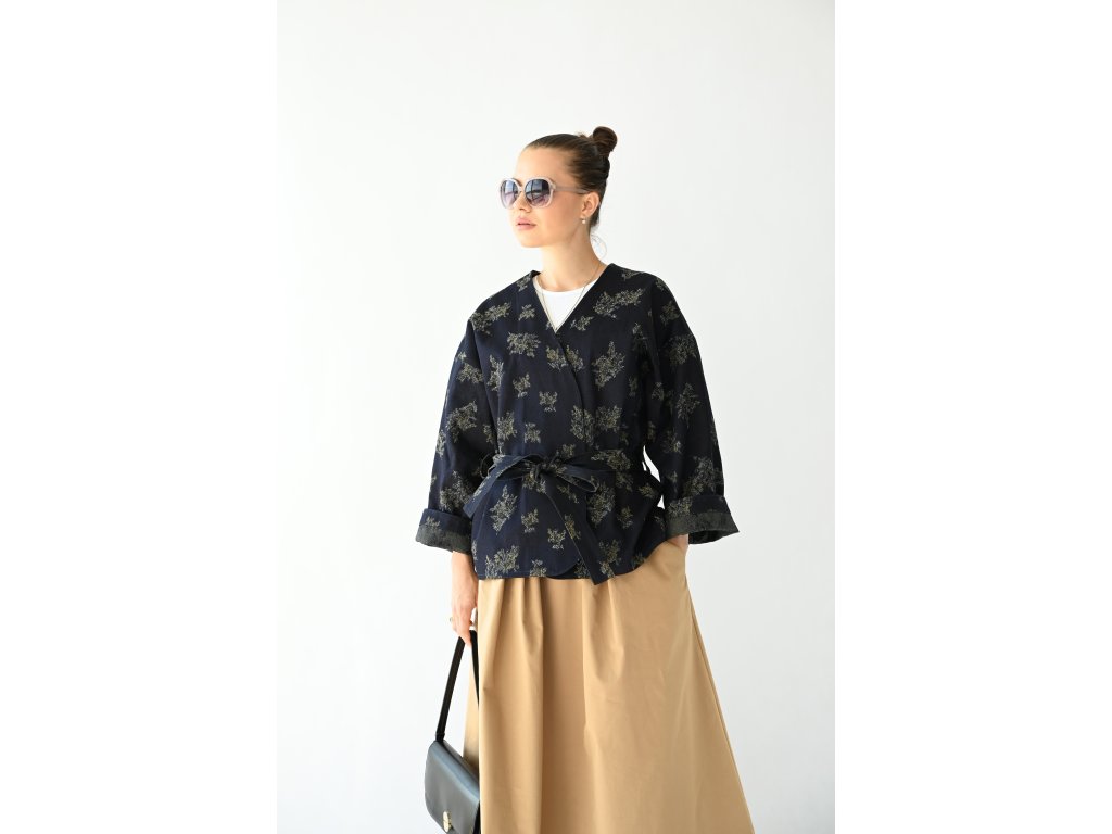 Kimono Ao je ušité z pevnější rifloviny s motivem vytkaných květů. Barva je temně modrá, nešisovaná. Květy jsou zelonožluté. Střih kimona je volný, rovný. Délka je k bokům. Rukávy jsou taky volné a tak pod kimono obléknete pohodlně i oversize triko nebo košili. Rukávy se nosí ohrnuté. Kabátek nemá kapsy, protože je kvůli pásku není kam umístit, pásek by je překrýval. Kabátek se nosí zavázaný. Kimono nemá podšívku.