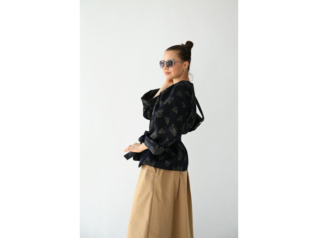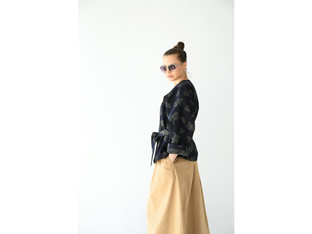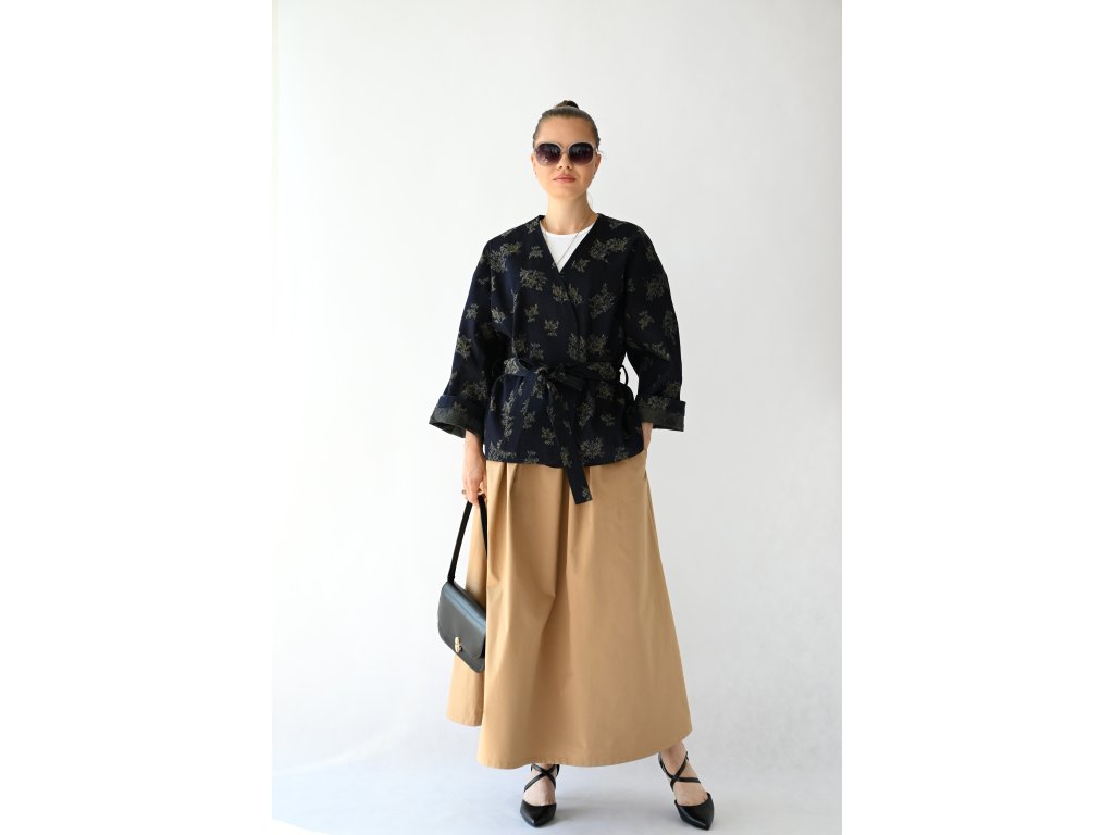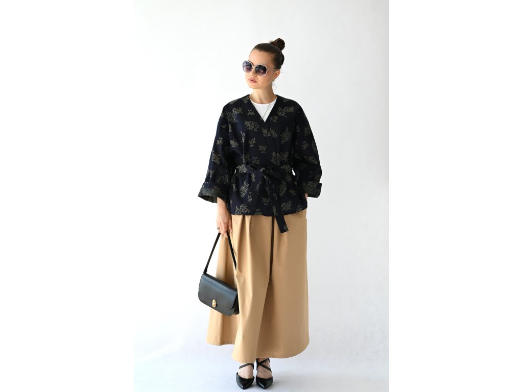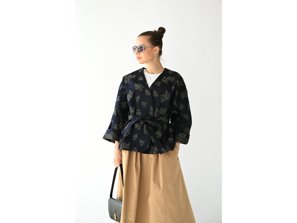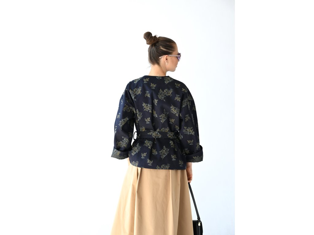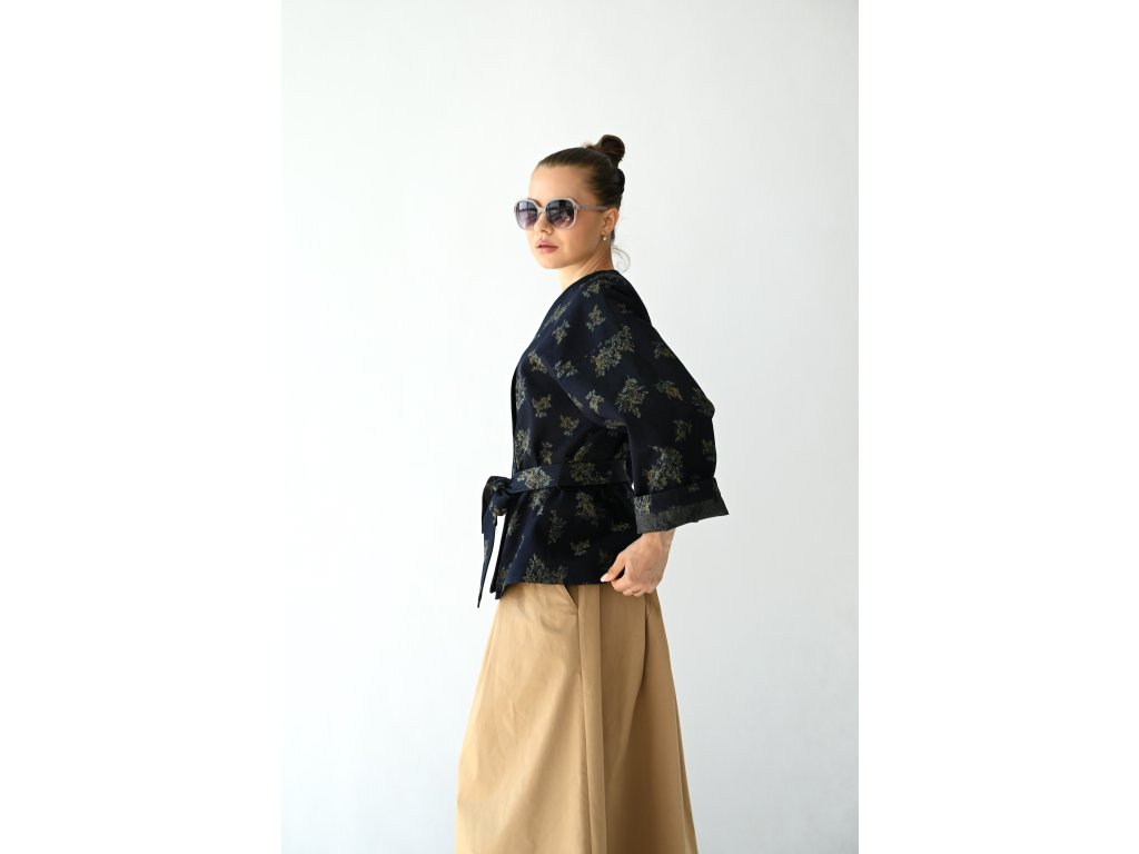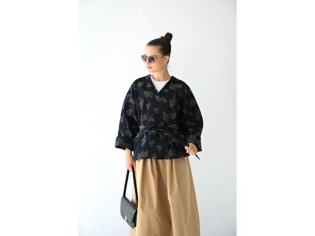 Kimono Ao je ušité z pevnější rifloviny s motivem vytkaných květů. Barva je temně modrá, nešisovaná. Květy jsou zelonožluté. Střih kimona je volný, rovný. Délka je k bokům. Rukávy jsou taky volné a tak pod kimono obléknete pohodlně i oversize triko nebo košili. Rukávy se nosí ohrnuté. Kabátek nemá kapsy, protože je kvůli pásku není kam umístit, pásek by je překrýval. Kabátek se nosí zavázaný. Kimono nemá podšívku.