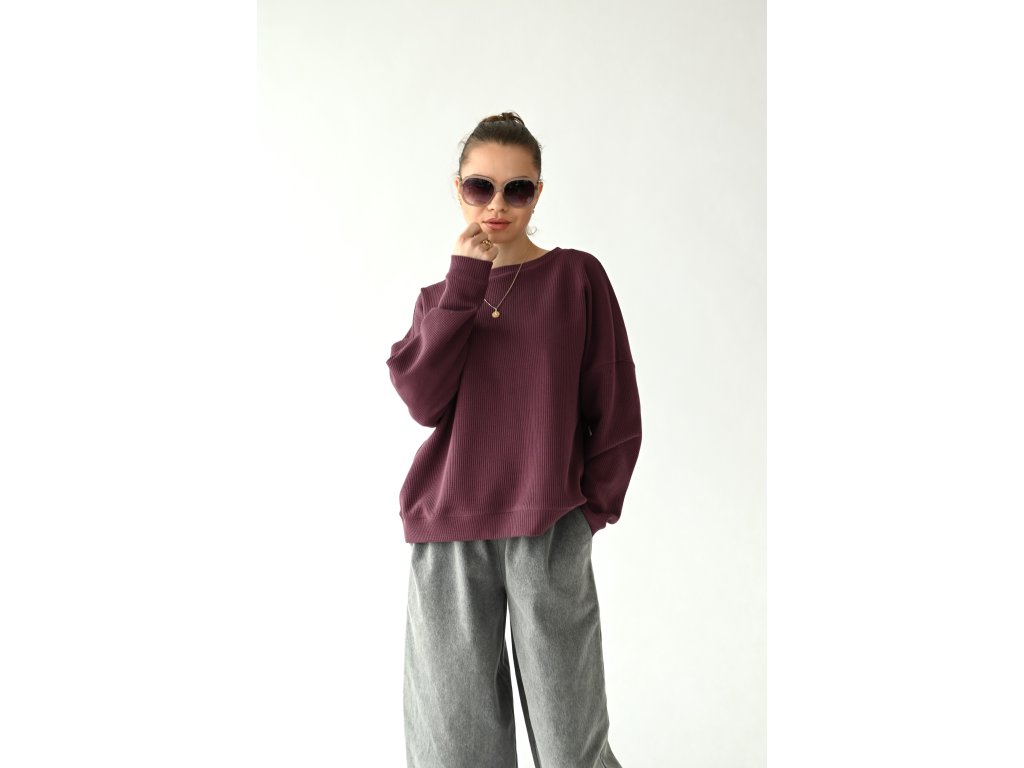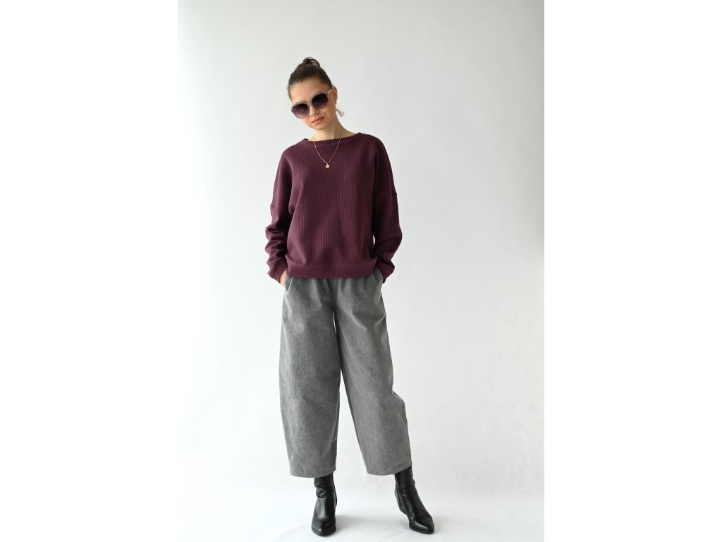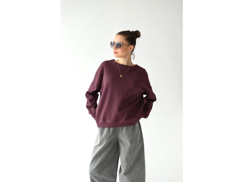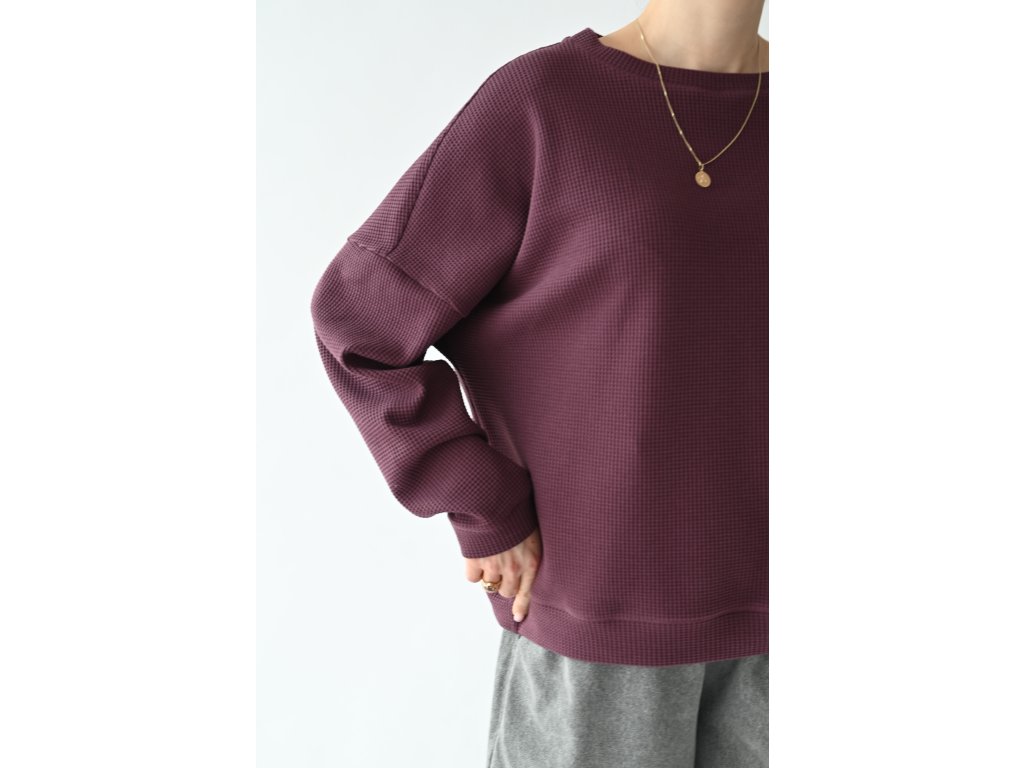 Basic mikina je ušita z bavlněné pleteniny s dezénem vafloviny. Materiál je pružný, pohodlný a lehký. Střih New Evran se osvědčil. Je velmi univerzální, sluší prakticky každé postavě a výborně doplňuje širokou škálu outfitů od sukní přes šaty až ke kalhotám a riflím. Střih je lehce oversize, rukávy jsme udělali o facku delší, aby seděla i vyšším postavám.