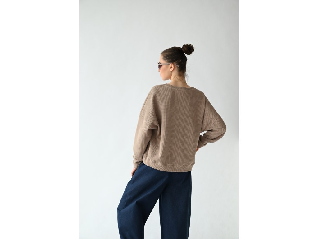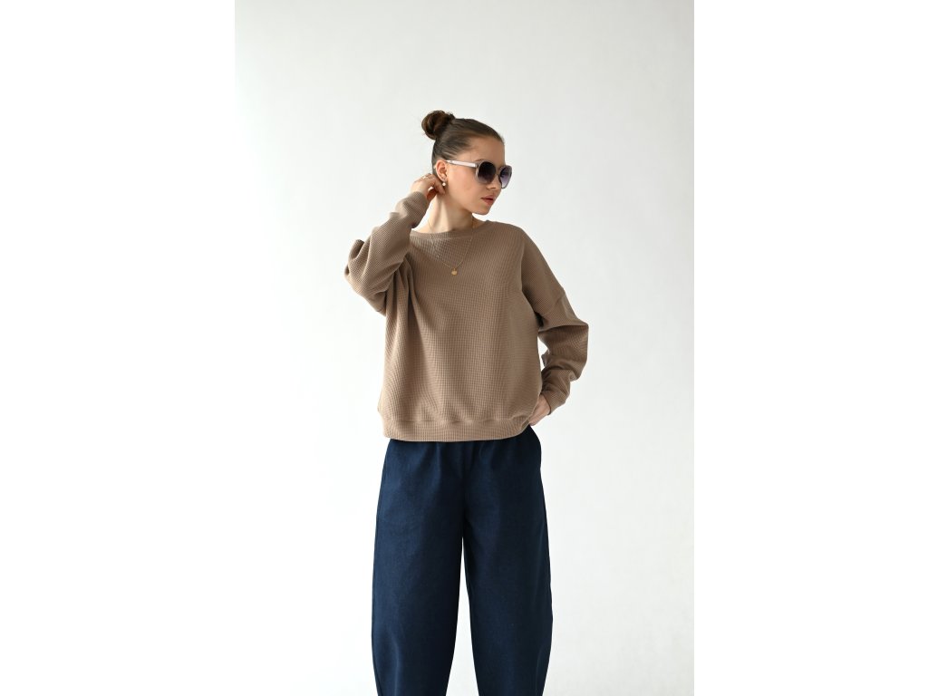 Basic mikina je ušita z bavlněné pleteniny s dezénem vafloviny. Materiál je pružný, pohodlný a lehký. Střih New Evran se osvědčil. Je velmi univerzální, sluší prakticky každé postavě a výborně doplňuje širokou škálu outfitů od sukní přes šaty až ke kalhotám a riflím. Střih je lehce oversize, rukávy jsme udělali o facku delší, aby seděla i vyšším postavám.