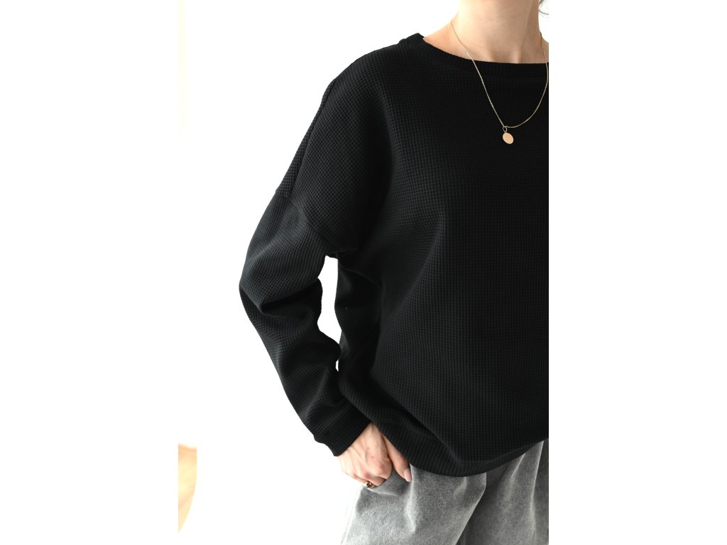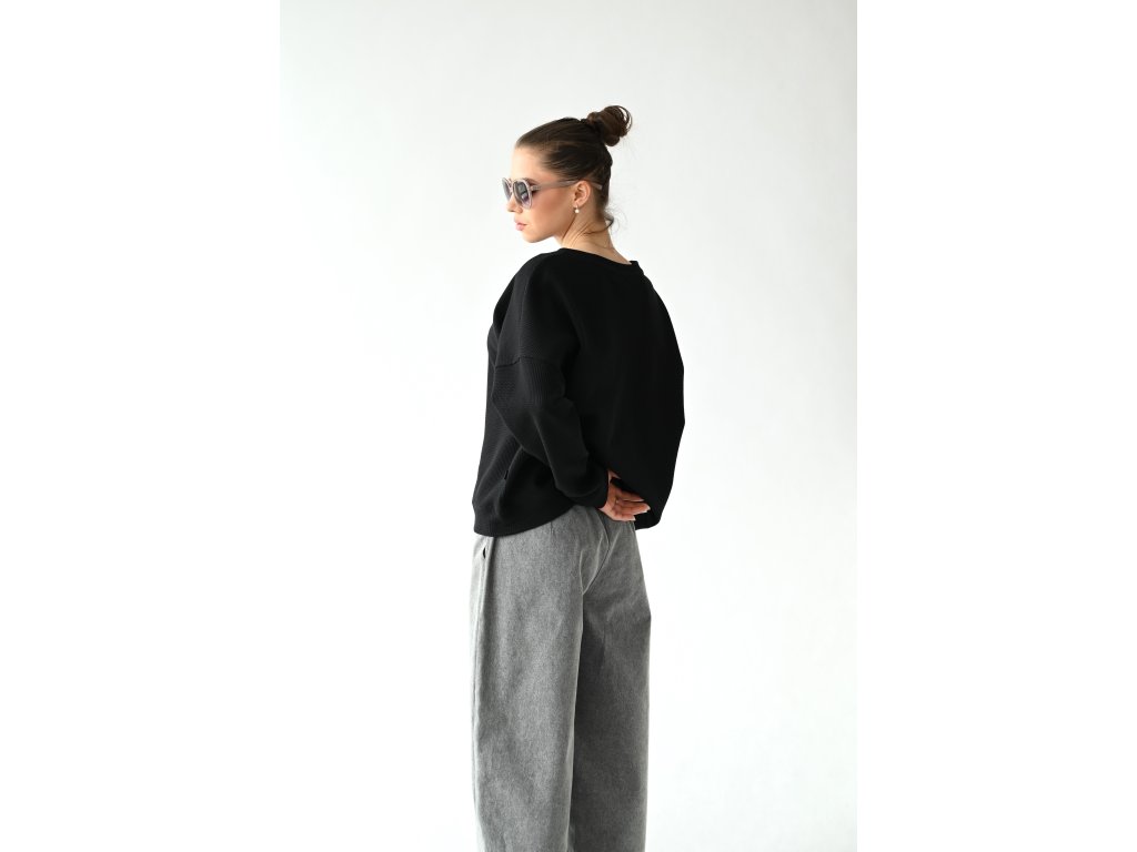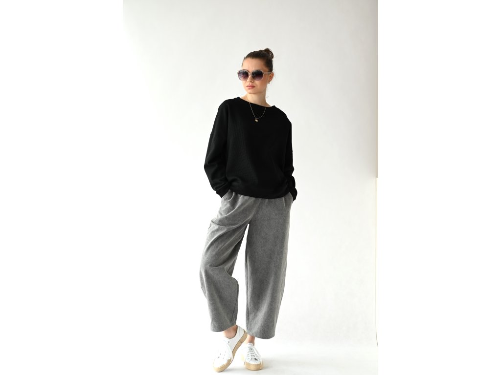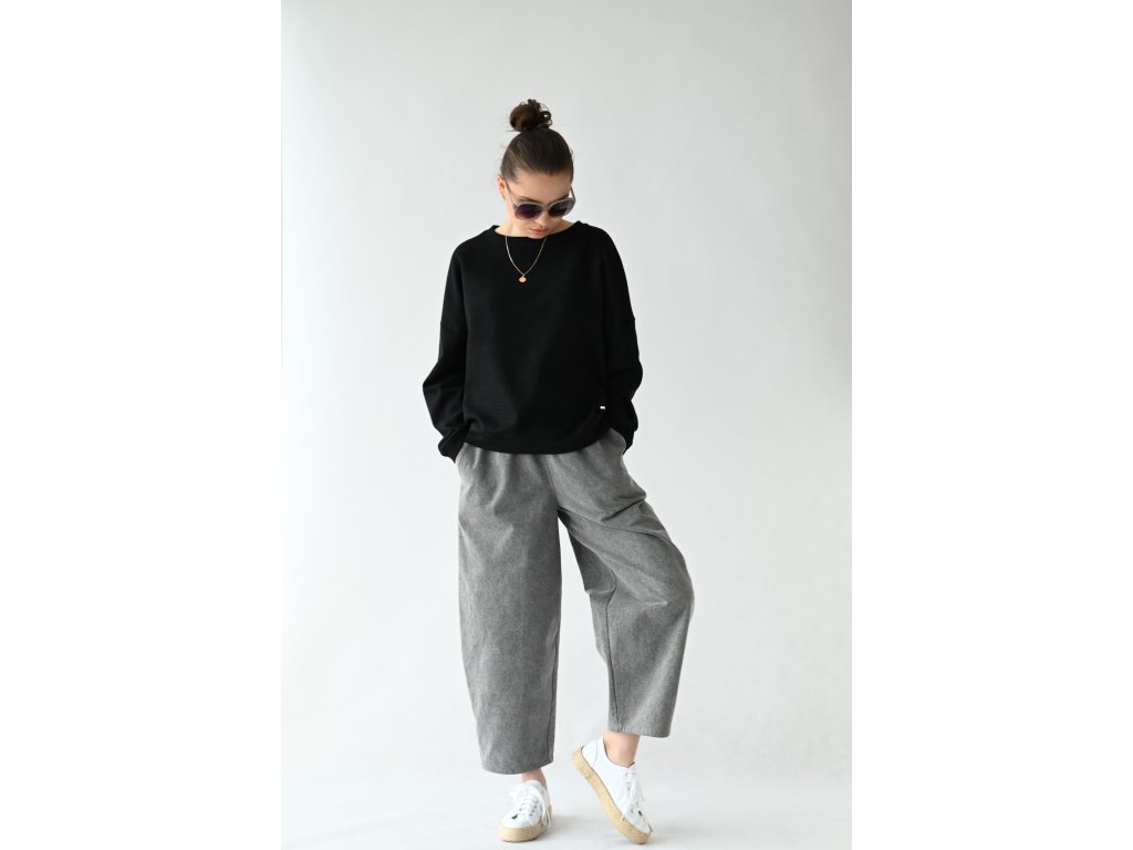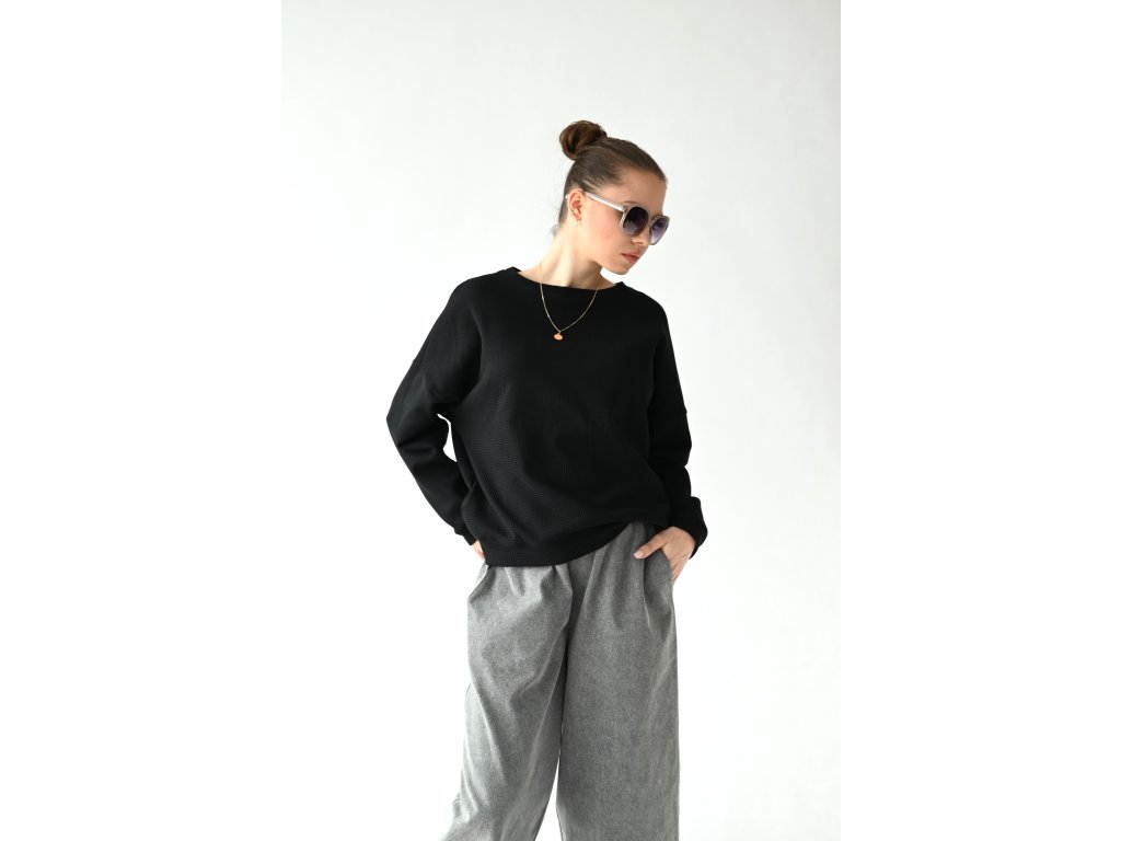 Basic mikina je ušita z bavlněné pleteniny s dezénem vaflovny. Materiál je pružný, pohodlný a lehký. Střih New Evran se osvědčil. Je velmi univerzální, sluší prakticky každé postavě a výborně doplňuje širokou škálu outfitů od sukní přes šaty až ke kalhotám a riflím. Střih je lehce oversize, rukávy jsme udělali o facku delší, aby seděla i vyšším postavám.