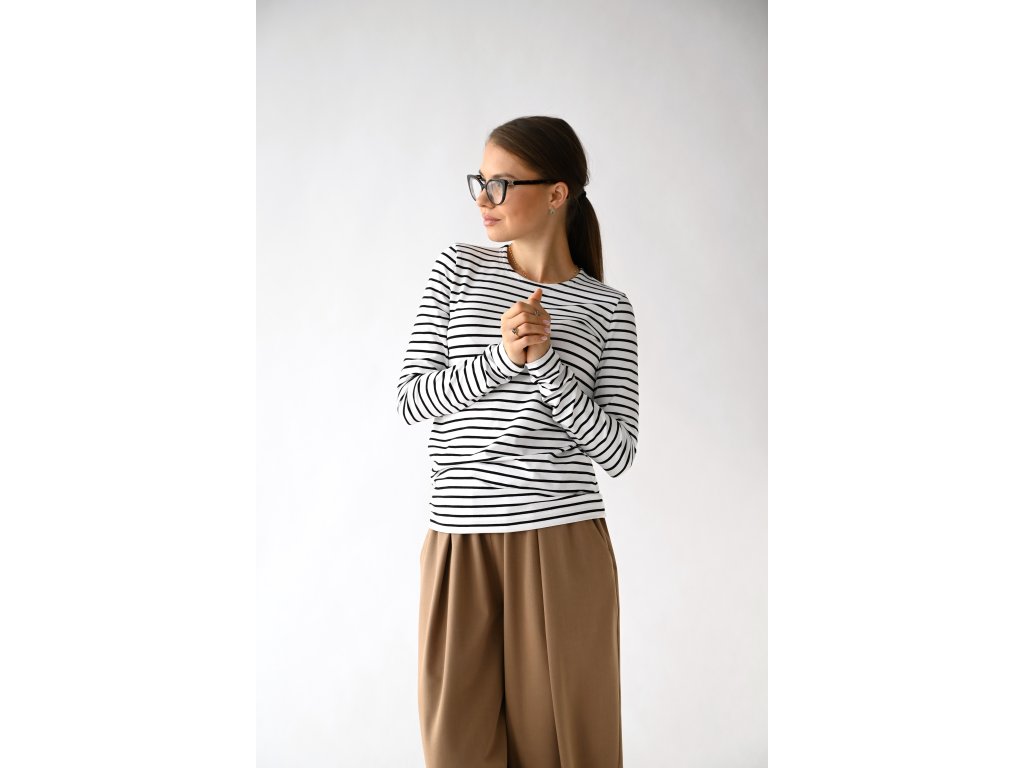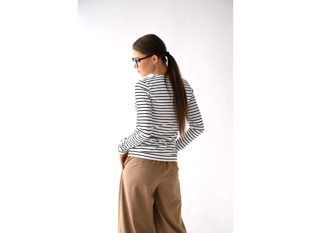 Modelka je vysoká 168 cm. Na sobě má velikost S. Tento materiál není pružný tak jako žebrovaný úplet, proto doporučuji volit o číslo větší velikost.