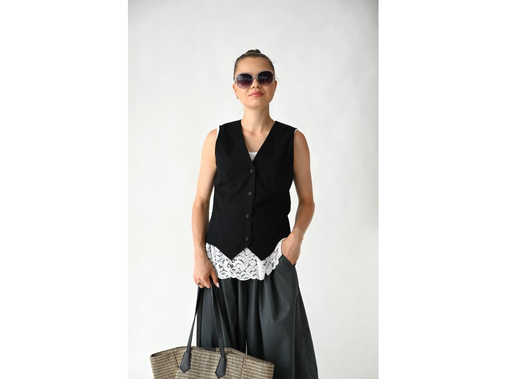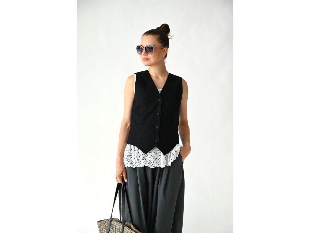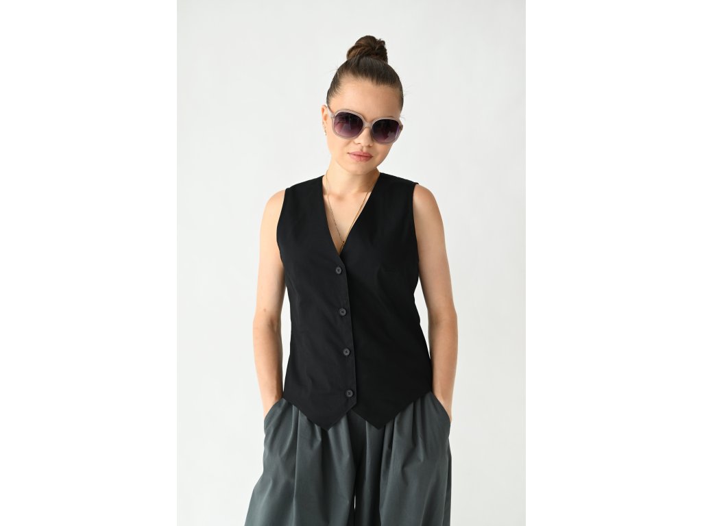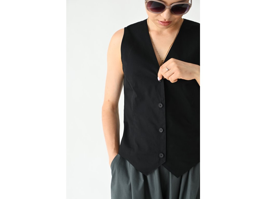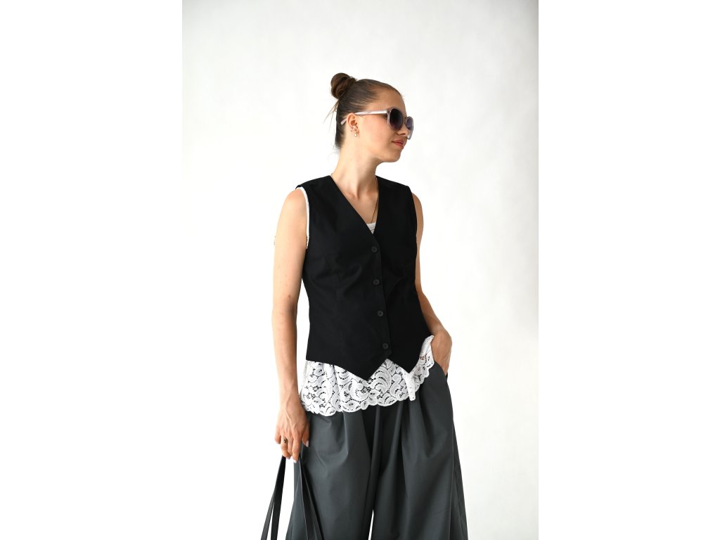 Dámská vestička Romeo je klasického střihu. Ušitá je ze dvou vrstev bavlněného popelínu, přičemž druhá vrstva skvěle supluje podšívku, která by se v letním počasí nepříjemně lepila na tělo. Díky dvěma vrstvám vestička krásně drží tvar, ale zůstává lehká a prodyšná. Přední díl je zakončen typickými šůsky. Zapínaní má na čtyři knoflíky.