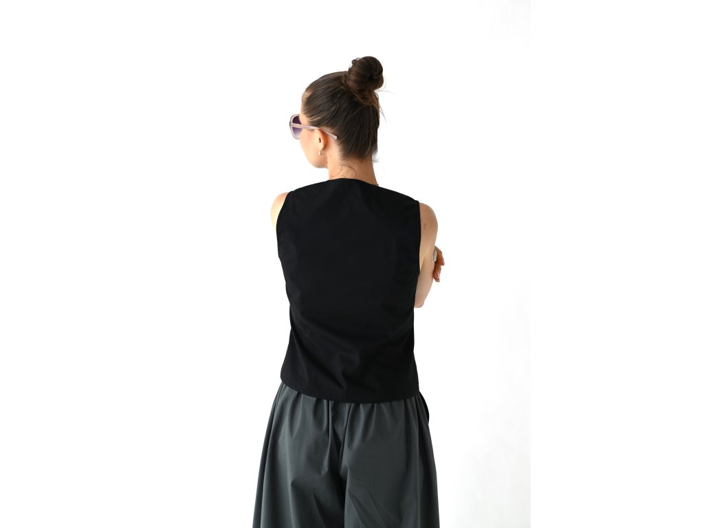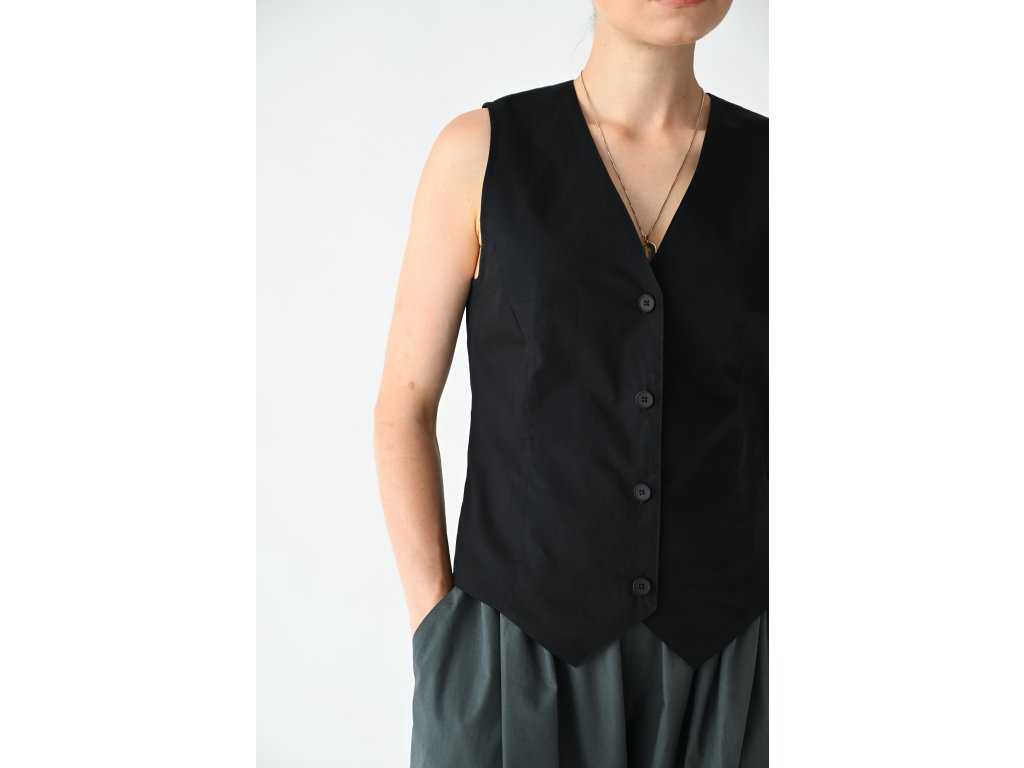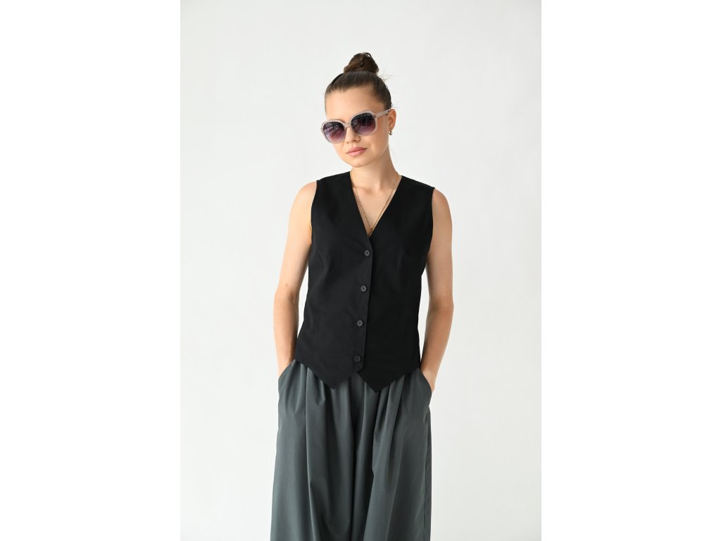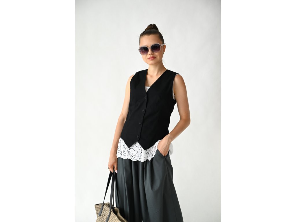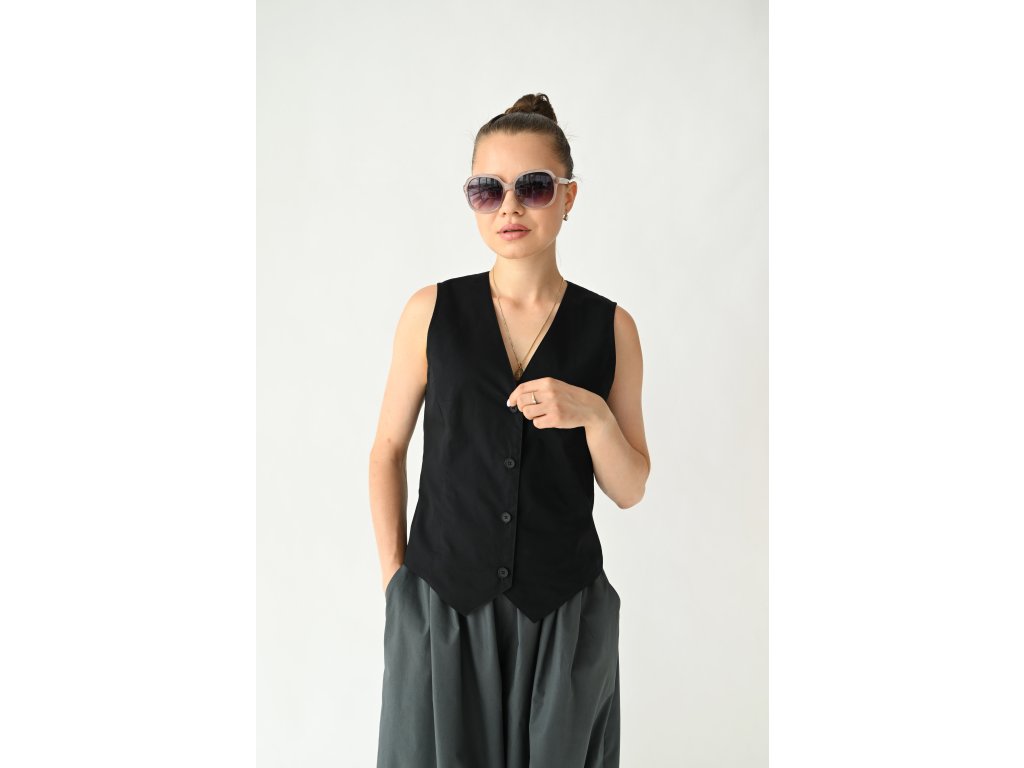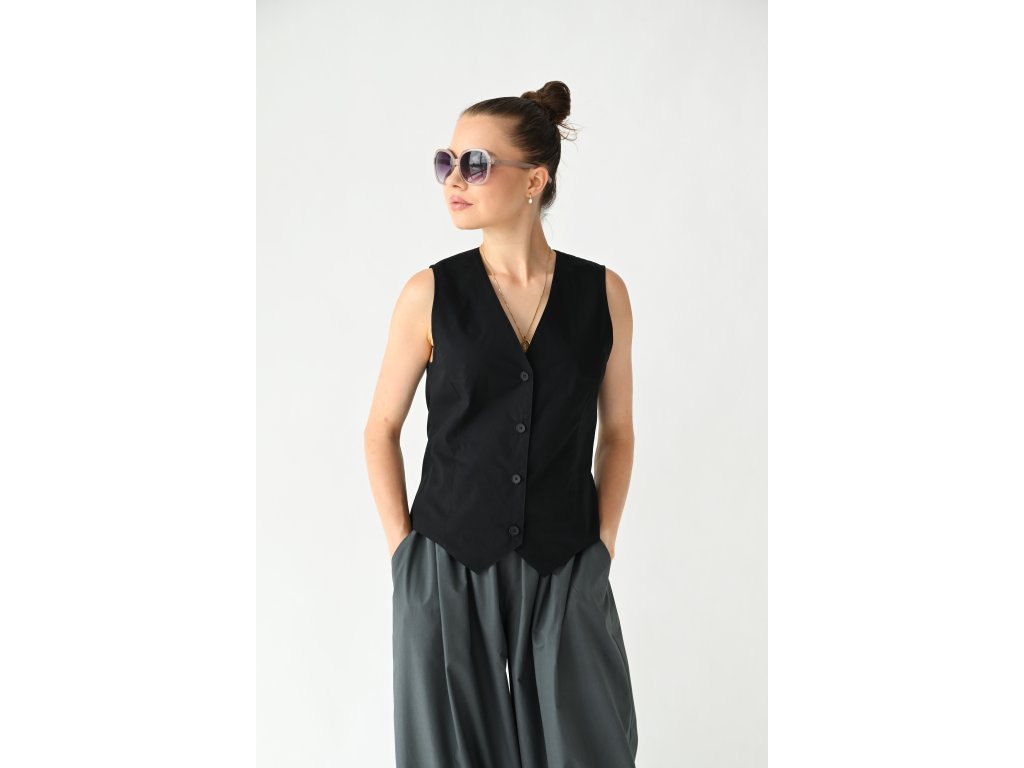 Dámská vestička Romeo je klasického střihu. Ušitá je ze dvou vrstev bavlněného popelínu, přičemž druhá vrstva skvěle supluje podšívku, která by se v letním počasí nepříjemně lepila na tělo. Díky dvěma vrstvám vestička krásně drží tvar, ale zůstává lehká a prodyšná. Přední díl je zakončen typickými šůsky. Zapínaní má na čtyři knoflíky.